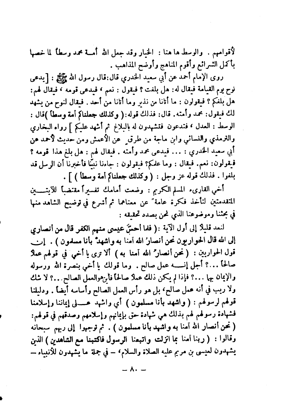 روى الإمام أحمد عن أبي سعيد الخدري قال: قال رسول الله - صلى الله عليه وسلم -: [يدعى نوح يوم القيامة فيقال له: هل بلغت؟ فيقول: نعم فيدعى قومه فيقال لهم: هل بلغكم؟ فيقولون: ما أتانا من نذير من أحد فيقال لنوح من يشهد لك فيقول: محمد وأمته قال: فذلك قوله: (وكذلك جعلناكم أمة وسطاً) قال: الوسط: العدل فتدعون فتشهدون له بالبلاغ ثم أشهد عليكم] رواه البخاري والترمذي والنسائي وابن ماجه من طريق عن الأعمش ومن حديث لأحمد عن أبي سعيد الخدري: فيدعي محمد وأمته فيقال لهم: هل بلغ هذا قومه؟ فيقولون: نعم، فيقال: وما علمكم؟ فيقولون: جاءنا نبينا فأخبرنا أن الرسل قد بلغوا قوله عز وجل: (وكذلك جعلناكم أمة وسطاً)]