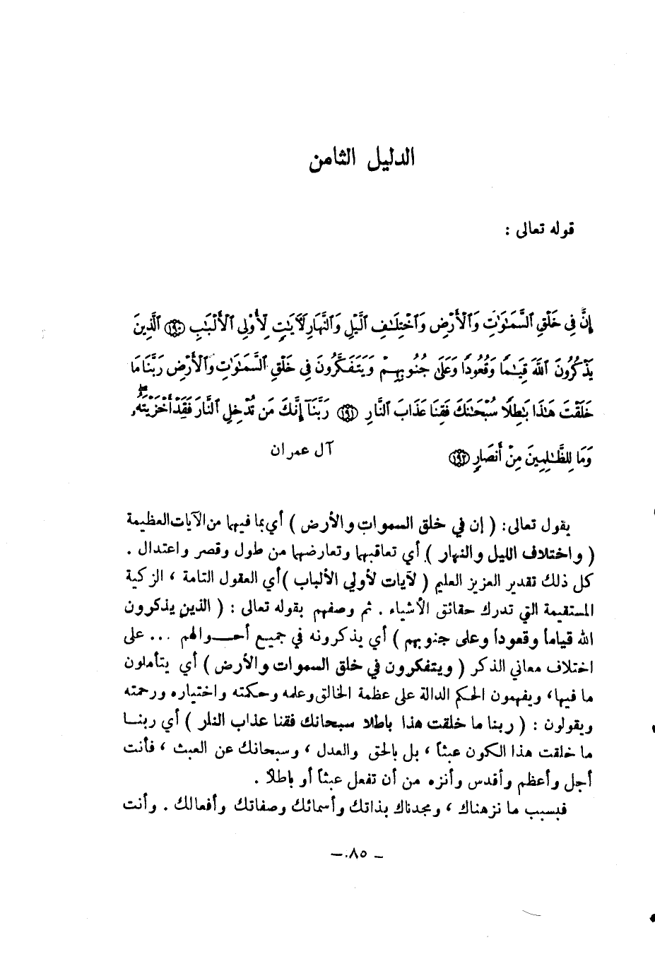 إن في خلق السموات والأرض واختلاف الليل والنهار لآيات لأولي الألباب (190) الذين يذكرون الله قيماً وقعوداً وعلى جنوبهم ويتفكرون في خلق السموات والأرض ربنا ما خلقت هذا باطلاً سبحانك فقنا عذاب النار (191) ربنا إنك من تدخل النار فقد أخزيته وما للظالمين من أنصار (192) ... آل عمران