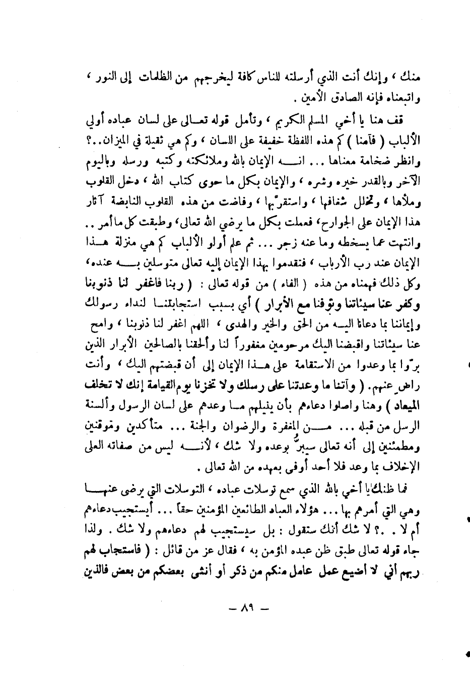 قف هنا يا أخي المسلم الكريم وتأمل قوله تعالى على لسان عباده أولي الألباب (فآمنا) كم هذه اللفظة خفيفة على اللسان وكم هي ثقيلة في الميزان .. ؟ وانظر ضخامة معناها ... إنه الإيمان بالله وملائكته وكتبه ورسله وباليوم الآخر وبالقدر خيره وشره والإيمان بكل ما حوى كتاب الله دخل القلوب وملأها وتخلل شغافها واستقر بها وفاضت من هذه القلوب النابضة آثار هذا الإيمان على الجوارح فعملت بكل ما يرضي الله تعالى وطبقت كل ما أمر .. وانتهت عما يسخطه وما عنه زجر ... ثم علم أولو الألباب كم هي منزلة هذا الإيمان عند رب الأرباب فتقدموا بهذا الإيمان إليه تعالى متوسلين به عنده وكل ذلك فهمناه من هذه (الفاء) من قوله تعالى: (ربنا فاغفر لنا ذنوبنا وكفر عنا سيئاتنا وتوفنا مع الأبرار) أي بسبب استجابتنا لنداء رسولك وإيماننا بما دعانا من الحق والخير والهدى، اللهم اغفر لنا ذنوبنا وامح عنا سيئاتنا واقبضنا إليك مرحومين مغفوراً لنا وألحقنا بالصالحين الأبرار الذين بروا بما وعدوا من الاستقامة على هذا الإيمان إلى أن قبضتهم إليك وأنت راض عنهم. (وآتنا ما وعدتنا على رسلك ولا تخزنا يوم القيامة إنك لا تخلف الميعاد) وهنا واصلوا دعاءهم بأن ينيلهم ما وعدهم على لسان الرسول وألسنة الرسل من قبله ... من المغفرة والرضوان والجنة ... متأكدين وموقنين ومطمئنين إلى أنه تعالى سيبر بوعده ولا شك لأنه ليس من صفاته العلى الإخلاف بما وعد فلا أحد أوفى بعهده من الله تعالى.