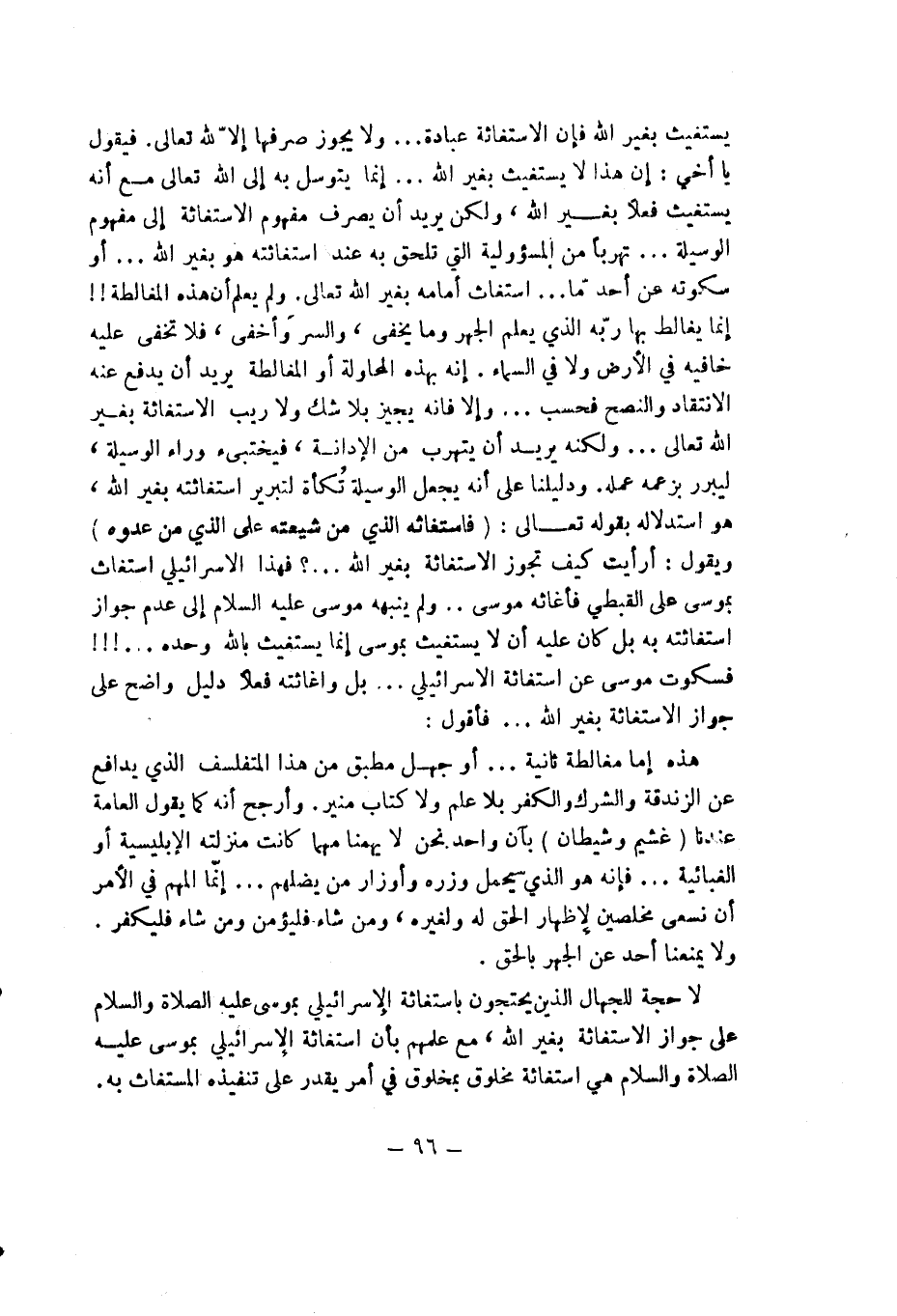 يستغيث بغير الله فإن الاستغاثة عبادة ... ولا يجوز صرفها إلا لله تعالى فيقول يا أخي إن هذا لا يستغيث بغير الله ... إنما يتوسل به إلى الله تعالى مع أنه يستغيث فعلاً بغير الله ولكن يريد أن يصرف مفهوم الاستغاثة إلى مفهوم الوسيلة ... تهرباً من المسؤولية التي تلحق به عند استغاثته هر بغير الله ... أو سكوته عن أحد ما ... استغاث أمامه بغير الله تعالى. ولم يعلم أن هذه المغالطة!! إنما يغالط بها ربه الذي يعلم الجهر وما يخفى والسر وأخفى فغلا تخفى عليه خافية في الأرض ولا في السماء إنه بهذه المحاولة أوالمغالطة يريد أن يدفع عنه الانتقاد والنصح فحسب ... وإلا فإنه يجيز بلا شك ولا ريب الاستغاثة بغير الله تعالى ... ولكنه يريد أن يتهرب من الإدانة فيختبئ وراء الوسيلة ليبرر بزعمه عمله ودليلنا على أنه يجعل الوسيلة تكأة لتبرير استغاثته بغير الله هو استدلاله بقوله تعالى: (فاستغاثه الذي من شيعته على الذي من عدوه) ويقول: أرأيت كيف تجوز الاستغاثة بغير الله ... ؟ فهذا الاسرائيلي استغاث بموسى على القبطي فأغاثه موسى .. ولم ينبهه موسى عليه السلام إلى عدم جواز استغاثته به بل كان عليه أن لا يستغيث بموسى عليه إنما يستغيث بالله وحده ... !!! فسكوت موسى عن استغاثة الاسرائيلي ... بل واغاثته فعلاً دليل واضح على جواز الاستغاثة بغير الله ... فأقول: هذه إما مغالطة ثانية أو جهل مطبق من هذا المتفلسف الذي يدافع عن الزندقة والشرك والكفر بلا علم ولا كتاب منير. وأرجح أنه كما يقول العامة من عندنا (غشيم وشيطان) بأن واحد نحن لا يهمنا مهما كانت منزلته الإبليسية أو الغبائية ... فإنه هو الذي سيحمل وزره وأوزار من يضلهم ... إنما المهم في الأمر أن نسعى مخلصين لإظهار الحق له ولغيره ومن نشاء فليؤمن ومن شاء فليكفر. ولا يمنعنا أحد عن الجهر بالحق.