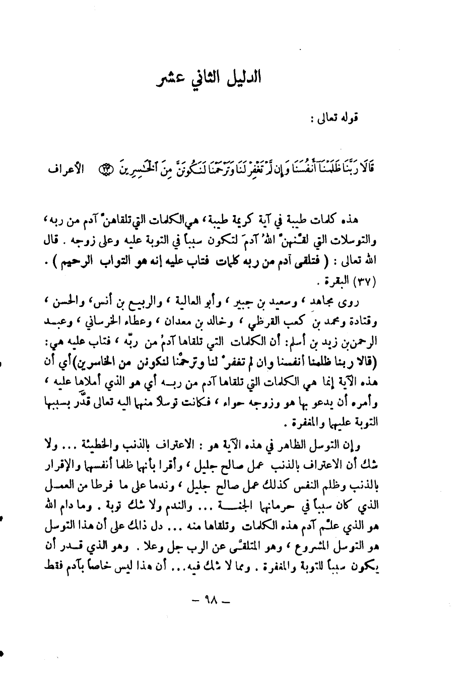 وإن التوسل الظاهر في هذه الآية هو: الاعتراف بالذنب والخطيئة ... ولا شك أن الاعتراف بالذنب عمل صالح جليل وأقرأ بأنهما ظلما أنفسهما والإقرار بالذنب وظلم النفس كذلك عمل صالح جليل وندما على ما فرطا من العمل الذي كان سبباً في حرمانهما الجنة ... والندم ولا شك توبة وما دام الله هو الذي علم آدم هذه الكلمات وتلقاها منه ... دل ذلك على أن هذا التوسل هو التوسل المشروع وهو المتلقى عن الرب جل وعلا وهو الذي قدر أن يكون سبباً في للتوبة والمغفرة ومما لا شك فيه ... أن هذا ليس خاصاً بآدم فقط