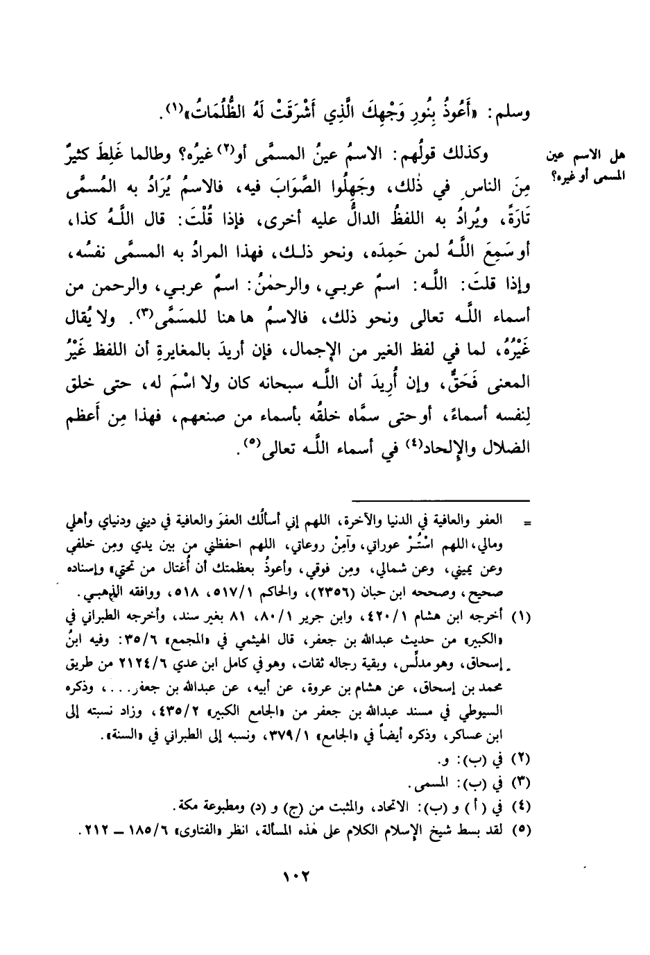 وَسَلَّمَ: «أَعُوذُ بِنُورِ وَجْهِكَ الَّذِي أَشْرَقَتْ لَهُ الظُّلُمَاتُ» .