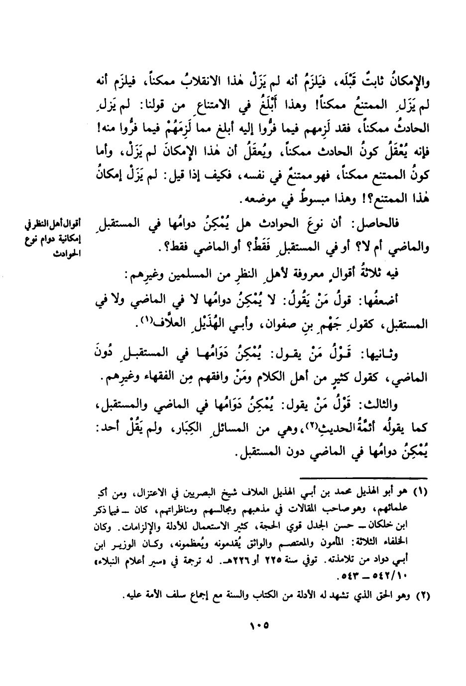 فَالْحَاصِلُ: أَنَّ نَوْعَ الْحَوَادِثِ هَلْ يُمْكِنُ دَوَامُهَا فِي الْمُسْتَقْبَلِ وَالْمَاضِي أَمْ لَا؟ أَوْ فِي الْمُسْتَقْبَلِ فَقَطْ؟ أَوِ الْمَاضِي فَقَطْ؟ فِيهِ ثَلَاثَةُ أَقْوَالٍ مَعْرُوفَةٍ لِأَهْلِ النَّظَرِ مِنَ الْمُسْلِمِينَ وَغَيْرِهِمْ: