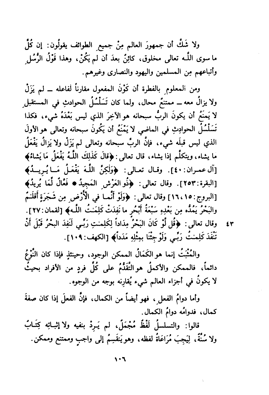 وَمِنَ الْمَعْلُومِ بِالْفِطْرَةِ أَنَّ كَوْنَ الْمَفْعُولِ مُقَارِنًا لِفَاعِلِهِ لَمْ يَزَلْ وَلَا يَزَالُ مَعَهُ - مُمْتَنِعٌ مُحَالٌ، وَلَمَّا كَانَ تَسَلْسُلُ الْحَوَادِثِ فِي الْمُسْتَقْبَلِ لَا يَمْنَعُ أَنْ يَكُونَ الرَّبُّ سُبْحَانَهُ هُوَ الْآخِرَ الَّذِي لَيْسَ بَعْدَهُ شَيْءٌ، فَكَذَا تَسَلْسُلُ الْحَوَادِثِ فِي الْمَاضِي لَا يَمْنَعُ أَنْ يَكُونَ سُبْحَانَهُ وَتَعَالَى هُوَ الْأَوَّلَ الَّذِي لَيْسَ قَبْلَهُ شَيْءٌ. فَإِنَّ الرَّبَّ سُبْحَانَهُ وَتَعَالَى لَمْ يَزَلْ وَلَا يَزَالُ، يَفْعَلُ مَا يَشَاءُ وَيَتَكَلَّمُ إِذَا يَشَاءُ. قَالَ تَعَالَى: {قَالَ كَذَلِكَ اللَّهُ يَفْعَلُ مَا يَشَاءُ} [آل عمران: 40] (آلِ عِمْرَانَ: 40) . وَقَالَ تَعَالَى: {وَلَكِنَّ اللَّهَ يَفْعَلُ مَا يُرِيدُ} [البقرة: 253] (الْبَقَرَةِ: 253) . وَقَالَ تَعَالَى: {ذُو الْعَرْشِ الْمَجِيدُ - فَعَّالٌ لِمَا يُرِيدُ} [البروج: 15 - 16] (الْبُرُوجِ: 15 - 16) . وَقَالَ تَعَالَى: {وَلَوْ أَنَّمَا فِي الْأَرْضِ مِنْ شَجَرَةٍ أَقْلَامٌ وَالْبَحْرُ يَمُدُّهُ مِنْ بَعْدِهِ سَبْعَةُ أَبْحُرٍ مَا نَفِدَتْ كَلِمَاتُ اللَّهِ} [لقمان: 27] (لُقْمَانَ: 27) . وَقَالَ تَعَالَى: {قُلْ لَوْ كَانَ الْبَحْرُ مِدَادًا لِكَلِمَاتِ رَبِّي لَنَفِدَ الْبَحْرُ قَبْلَ أَنْ تَنْفَدَ كَلِمَاتُ رَبِّي وَلَوْ جِئْنَا بِمِثْلِهِ مَدَدًا} [الكهف: 109] (الْكَهْفِ: 109) .