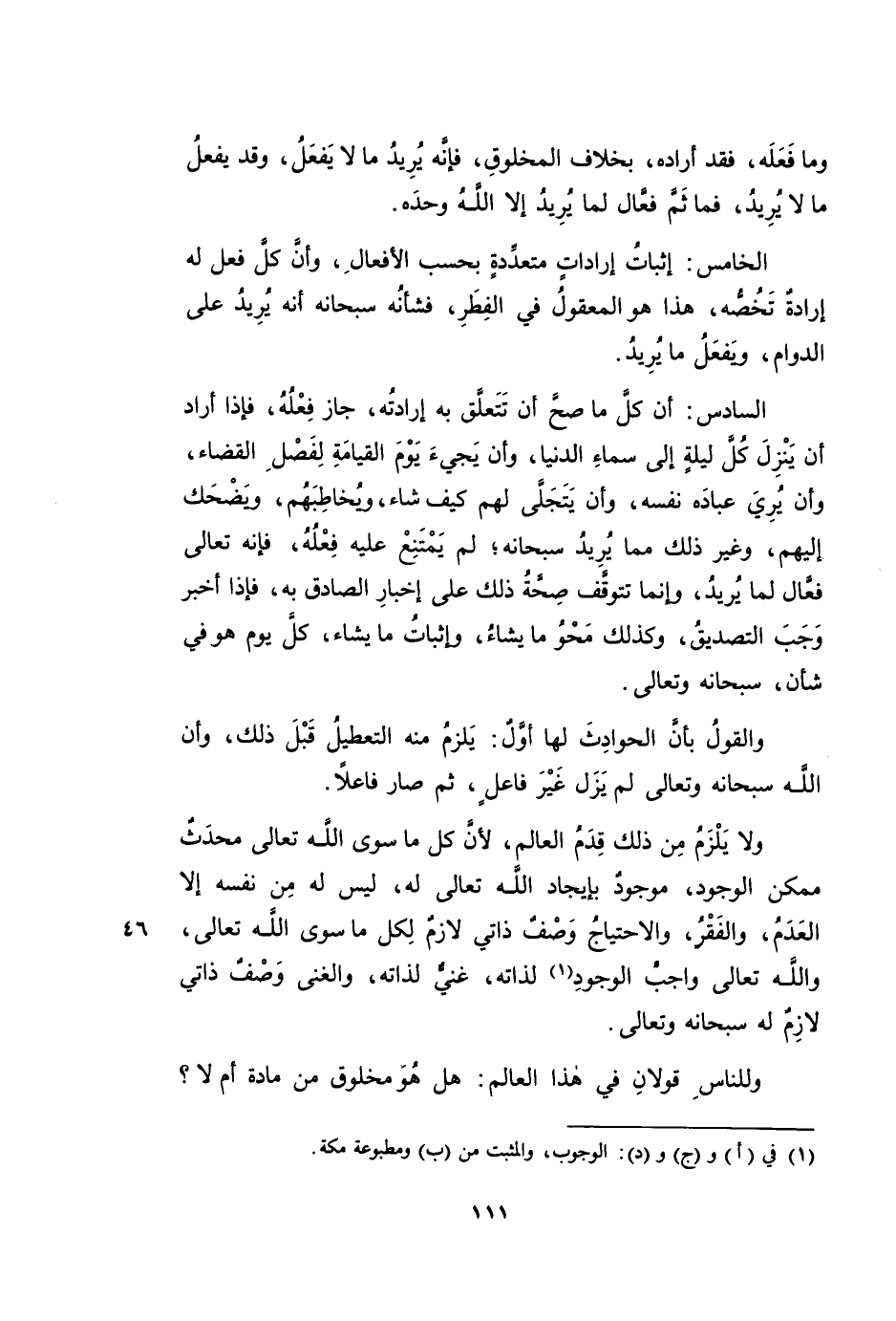 الْخَامِسُ: إِثْبَاتُ إِرَادَاتٍ مُتَعَدِّدَةٍ بِحَسَبِ الْأَفْعَالِ، وَأَنَّ كُلَّ فِعْلٍ لَهُ إِرَادَةٌ تَخُصُّهُ، هَذَا هُوَ الْمَعْقُولُ فِي الْفِطَرِ، فَشَأْنُهُ سُبْحَانَهُ أَنَّهُ يُرِيدُ عَلَى الدَّوَامِ وَيَفْعَلُ مَا يُرِيدُ.