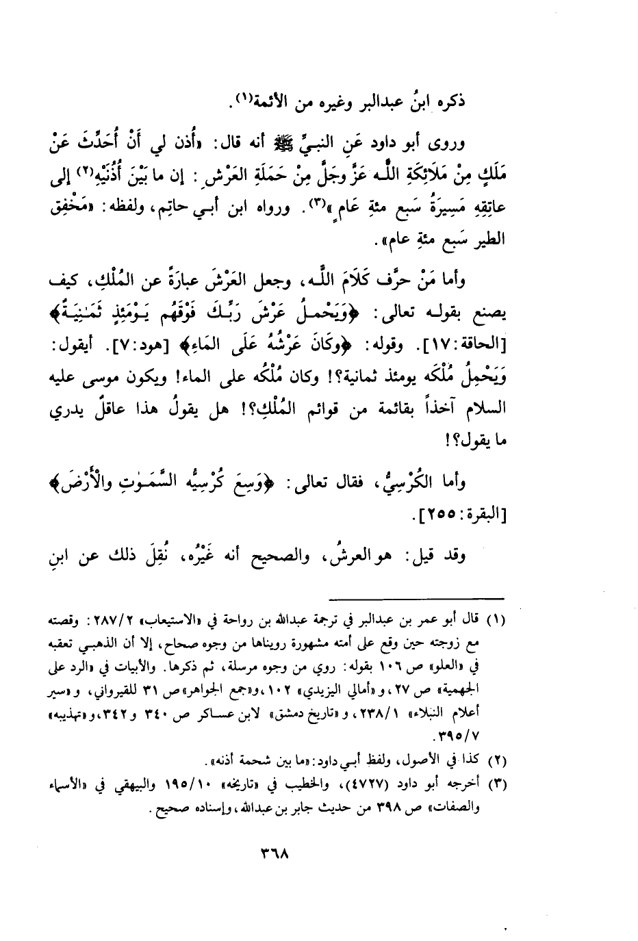 وَأَمَّا مَنْ حَرَّفَ كَلَامَ اللَّهِ، وَجَعَلَ الْعَرْشَ عِبَارَةً عَنِ الْمُلْكِ، كَيْفَ يَصْنَعُ بِقَوْلِهِ تَعَالَى: {وَيَحْمِلُ عَرْشَ رَبِّكَ فَوْقَهُمْ يَوْمَئِذٍ ثَمَانِيَةٌ} [الْحَاقَّةِ: 17] . وَقَوْلِهِ: {وَكَانَ عَرْشُهُ عَلَى الْمَاءِ} [هُودٍ: 7] . أَيَقُولُ: وَيَحْمِلُ مُلْكَهُ يَوْمَئِذٍ ثَمَانِيَةٌ؟ ! وَكَانَ مُلْكُهُ عَلَى الْمَاءِ! وَيَكُونُ مُوسَى عَلَيْهِ السَّلَامُ آخِذًا مِنْ قَوَائِمِ الْمُلْكِ؟ ! هَلْ يَقُولُ هَذَا عَاقِلٌ يَدْرِي مَا يَقُولُ؟ !