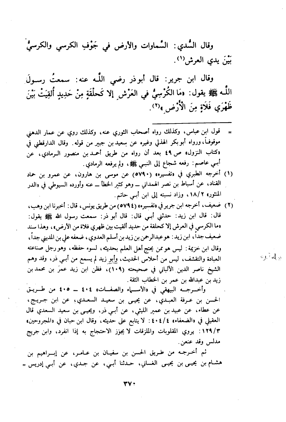 وَقَالَ السُّدِّيُّ: السَّمَاوَاتُ وَالْأَرْضُ فِي جَوْفِ الْكُرْسِيِّ وَالْكُرْسِيُّ بَيْنَ يَدَيِ الْعَرْشِ. وَقَالَ ابْنُ جَرِيرٍ: قَالَ أَبُو ذَرٍّ رَضِيَ اللَّهُ عَنْهُ: سَمِعْتُ رَسُولَ اللَّهِ صَلَّى اللَّهُ عَلَيْهِ وَسَلَّمَ يَقُولُ: «مَا الْكُرْسِيُّ فِي الْعَرْشِ إِلَّا كَحَلْقَةٍ مِنْ حَدِيدٍ أُلْقِيَتْ بَيْنَ ظَهْرَيْ فَلَاةٍ مِنَ الْأَرْضِ» .