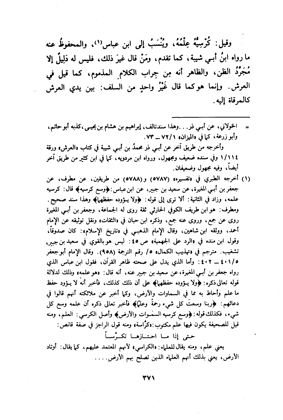 وَقِيلَ: كُرْسِيُّهُ: عِلْمُهُ، وَيُنْسَبُ إِلَى ابْنِ عَبَّاسٍ وَالْمَحْفُوظُ عَنْهُ مَا رَوَاهُ ابْنُ أَبِي شَيْبَةَ، كَمَا تَقَدَّمَ. وَمَنْ قَالَ غَيْرَ ذَلِكَ فَلَيْسَ لَهُ دَلِيلٌ إِلَّا مُجَرَّدُ الظَّنِّ. وَالظَّاهِرُ أَنَّهُ مِنْ جِرَابِ الْكَلَامِ الْمَذْمُومِ، كَمَا قِيلَ فِي الْعَرْشِ. وَإِنَّمَا هُوَ - كَمَا قَالَ غَيْرُ وَاحِدٍ مِنَ السَّلَفِ: بَيْنَ يَدَيِ الْعَرْشِ كَالْمَرْقَاةِ إِلَيْهِ.
