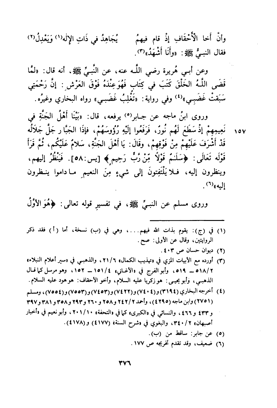فَقَالَ النَّبِيُّ صَلَّى اللَّهُ عَلَيْهِ وَسَلَّمَ: وَأَنَا أَشْهَدُ» . وَعَنْ أَبِي هُرَيْرَةَ رَضِيَ اللَّهُ عَنْهُ، عَنِ النَّبِيِّ صَلَّى اللَّهُ عَلَيْهِ وَسَلَّمَ، أَنَّهُ قَالَ: «لَمَّا قَضَى اللَّهُ الْخَلْقَ كَتَبَ فِي كِتَابٍ فَهُوَ عِنْدَهُ فَوْقَ الْعَرْشِ: إِنَّ رَحْمَتِي سَبَقَتْ غَضَبِي» وَفِي رِوَايَةٍ: تَغْلِبُ غَضَبِي رَوَاهُ الْبُخَارِيُّ وَغَيْرُهُ. وَرَوَى ابْنُ مَاجَهْ عَنْ جَابِرٍ يَرْفَعُهُ، قَالَ: «بَيْنَا أَهْلُ الْجَنَّةِ فِي نَعِيمِهِمْ إِذْ سَطَعَ لَهُمْ نُورٌ، فَرَفَعُوا إِلَيْهِ رُءُوسَهُمْ، فَإِذَا الْجَبَّارُ جَلَّ جَلَالُهُ قَدْ أَشْرَفَ عَلَيْهِمْ مِنْ فَوْقِهِمْ، وَقَالَ: يَا أَهْلَ الْجَنَّةِ، سَلَامٌ عَلَيْكُمْ، ثُمَّ قَرَأَ قَوْلَهُ تَعَالَى: {سَلَامٌ قَوْلًا مِنْ رَبٍّ رَحِيمٍ} [يس: 58] . فَيَنْظُرُ إِلَيْهِمْ، وَيَنْظُرُونَ إِلَيْهِ، فَلَا يَلْتَفِتُونَ إِلَى شَيْءٍ مِنَ النَّعِيمِ مَا دَامُوا يَنْظُرُونَ إِلَيْهِ» . وَرَوَى مُسْلِمٌ عَنِ النَّبِيِّ صَلَّى اللَّهُ عَلَيْهِ وَسَلَّمَ، فِي تَفْسِيرِ قَوْلِهِ تَعَالَى: