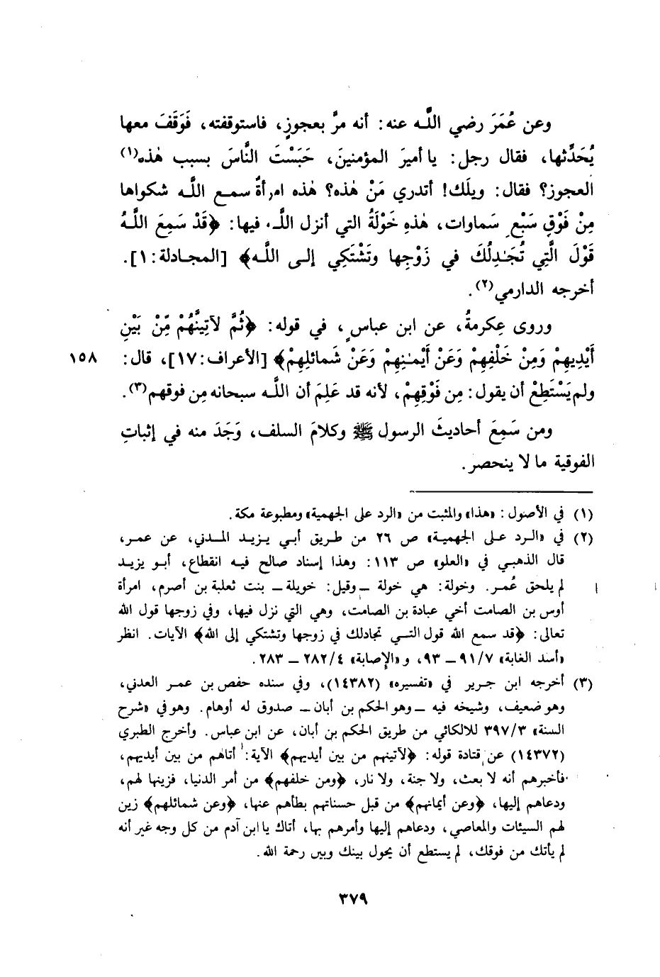 وَرَوَى عِكْرِمَةُ عَنِ ابْنِ عَبَّاسٍ، فِي قَوْلِهِ: {ثُمَّ لَآتِيَنَّهُمْ مِنْ بَيْنِ أَيْدِيهِمْ وَمِنْ خَلْفِهِمْ وَعَنْ أَيْمَانِهِمْ وَعَنْ شَمَائِلِهِمْ} [الْأَعْرَافِ: 17] قَالَ: وَلَمْ يَسْتَطِعْ أَنْ يَقُولَ مِنْ فَوْقِهِمْ، لِأَنَّهُ قَدْ عَلِمَ أَنَّ اللَّهَ سُبْحَانَهُ مِنْ فَوْقِهِمْ. وَمَنْ سَمِعَ أَحَادِيثَ الرَّسُولِ صَلَّى اللَّهُ عَلَيْهِ وَسَلَّمَ وَكَلَامَ السَّلَفِ، وَجَدَ مِنْهُ فِي إِثْبَاتِ الْفَوْقِيَّةِ مَا لَا يَنْحَصِرُ.