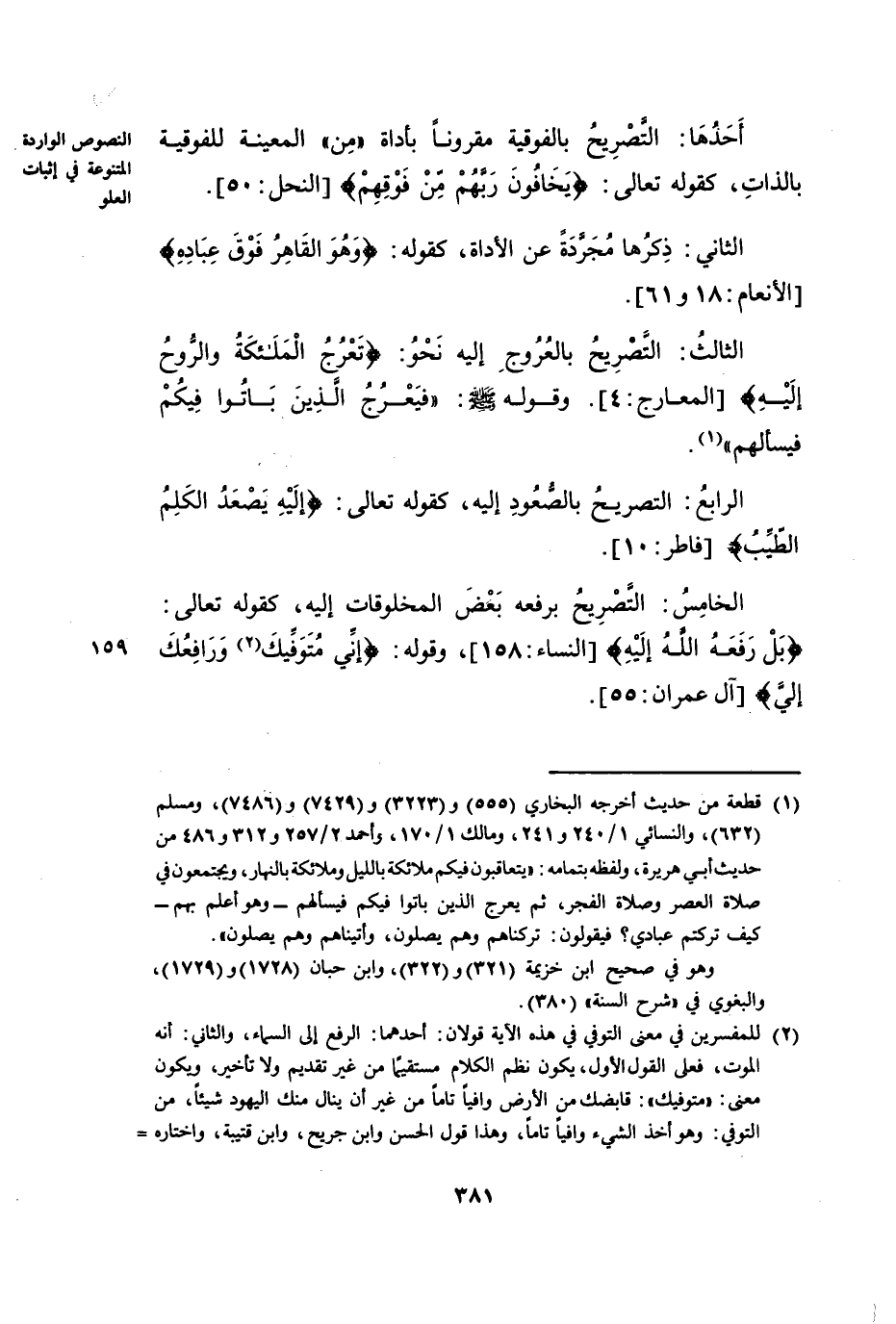 الْخَامِسُ: التَّصْرِيحُ بِرَفْعِهِ بَعْضَ الْمَخْلُوقَاتِ إِلَيْهِ، كَقَوْلِهِ تَعَالَى: {بَلْ رَفَعَهُ اللَّهُ إِلَيْهِ} [النِّسَاءِ: 158] . وَقَوْلِهِ: {إِنِّي مُتَوَفِّيكَ وَرَافِعُكَ إِلَيَّ} [آلِ عِمْرَانَ: 55] .