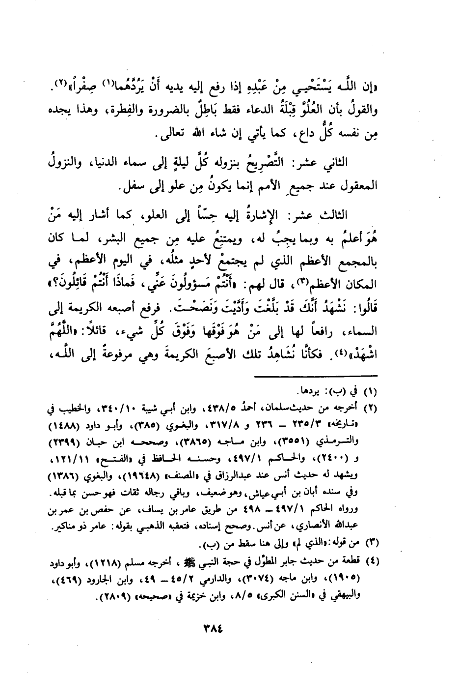 الثَّالِثَ عَشَرَ: الْإِشَارَةُ إِلَيْهِ حِسًّا إِلَى الْعُلُوِّ، كَمَا أَشَارَ إِلَيْهِ مَنْ هُوَ أَعْلَمُ بِرَبِّهِ وَبِمَا يَجِبُ لَهُ وَيَمْتَنِعُ عَلَيْهِ مِنْ جَمِيعِ الْبَشَرِ، لَمَّا كَانَ بِالْمَجْمَعِ الْأَعْظَمِ الَّذِي لَمْ يَجْتَمِعْ لِأَحَدٍ مِثْلُهُ، فِي الْيَوْمِ الْأَعْظَمِ، فِي الْمَكَانِ الْأَعْظَمِ، قَالَ لَهُمْ: أَنْتُمْ مَسْئُولُونَ عَنِّي، فَمَاذَا أَنْتُمْ قَائِلُونَ؟ قَالُوا. نَشْهَدُ أَنَّكَ قَدْ بَلَّغْتَ وَأَدَّيْتَ وَنَصَحْتَ، فَرَفَعَ أُصْبَعَهُ الْكَرِيمَةَ إِلَى السَّمَاءِ رَافِعًا لَهَا إِلَى مَنْ هُوَ فَوْقَهَا وَفَوْقَ كُلِّ شَيْءٍ، قَائِلًا: اللَّهُمَّ اشْهَدْ. فَكَأَنَّا نُشَاهِدُ تِلْكَ الْأُصْبُعَ الْكَرِيمَةَ وَهِيَ مَرْفُوعَةٌ إِلَى اللَّهِ،