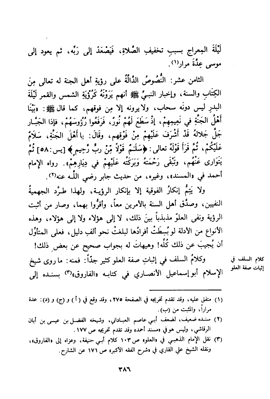 الثَّامِنَ عَشَرَ: النُّصُوصُ الدَّالَّةُ عَلَى رُؤْيَةِ أَهْلِ الْجَنَّةِ لَهُ تَعَالَى، مِنَ الْكِتَابِ وَالسُّنَّةِ، وَإِخْبَارُ النَّبِيِّ صَلَّى اللَّهُ عَلَيْهِ وَسَلَّمَ أَنَّهُمْ يَرَوْنَهُ كَرُؤْيَةِ الشَّمْسِ وَالْقَمَرِ لَيْلَةَ الْبَدْرِ لَيْسَ دُونَهُ سَحَابٌ، فَلَا يَرَوْنَهُ إِلَّا مِنْ فَوْقِهِمْ، كَمَا قَالَ صَلَّى اللَّهُ عَلَيْهِ وَسَلَّمَ: «بَيْنَا أَهْلُ الْجَنَّةِ فِي نَعِيمِهِمْ، إِذْ سَطَعَ لَهُمْ نُورٌ، فَرَفَعُوا رُءُوسَهُمْ، فَإِذَا الْجَبَّارُ جَلَّ جَلَالُهُ قَدْ أَشْرَفَ عَلَيْهِمْ مِنْ فَوْقِهِمْ، وَقَالَ: يَا أَهْلَ الْجَنَّةِ، سَلَامٌ عَلَيْكُمْ، ثُمَّ قَرَأَ قَوْلَهُ تَعَالَى: {سَلَامٌ قَوْلًا مِنْ رَبٍّ رَحِيمٍ} [يس: 58] » [يس: 58] . ثُمَّ يَتَوَارَى عَنْهُمْ، وَتَبْقَى رَحْمَتُهُ وَبَرَكَتُهُ عَلَيْهِمْ فِي دِيَارِهِمْ رَوَاهُ الْإِمَامُ أَحْمَدُ فِي الْمُسْنَدِ، وَغَيْرِهِ، مِنْ حَدِيثِ جَابِرٍ رَضِيَ اللَّهُ عَنْهُ.