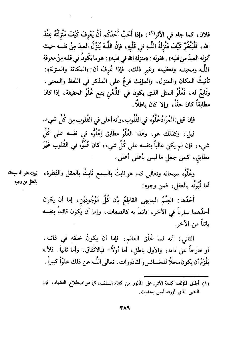 وَعُلُوُّهُ سُبْحَانَهُ وَتَعَالَى كَمَا هُوَ ثَابِتٌ بِالسَّمْعِ، ثَابِتٌ بِالْعَقْلِ وَالْفِطْرَةِ، أَمَّا ثُبُوتُهُ بِالْعَقْلِ، فَمِنْ وُجُوهٍ: