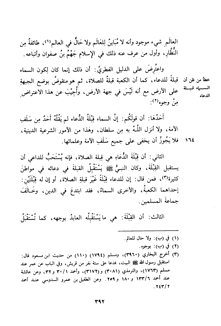 الثَّانِي: أَنَّ قِبْلَةَ الدُّعَاءِ هِيَ قِبْلَةُ الصَّلَاةِ، فَإِنَّهُ يُسْتَحَبُّ لِلدَّاعِي أَنْ يَسْتَقْبِلَ الْقِبْلَةَ، وَكَانَ النَّبِيُّ صَلَّى اللَّهُ عَلَيْهِ وَسَلَّمَ يَسْتَقْبِلُ الْقِبْلَةَ فِي دُعَائِهِ فِي مَوَاطِنَ كَثِيرَةٍ، فَمَنْ قَالَ إِنَّ لِلدُّعَاءِ قِبْلَةً غَيْرَ قِبْلَةِ الصَّلَاةِ، أَوْ إِنَّ لَهُ قِبْلَتَيْنِ: إِحْدَاهُمَا الْكَعْبَةُ وَالْأُخْرَى السَّمَاءُ -: فَقَدِ ابْتَدَعَ فِي الدِّينِ، وَخَالَفَ جَمَاعَةَ الْمُسْلِمِينَ.
