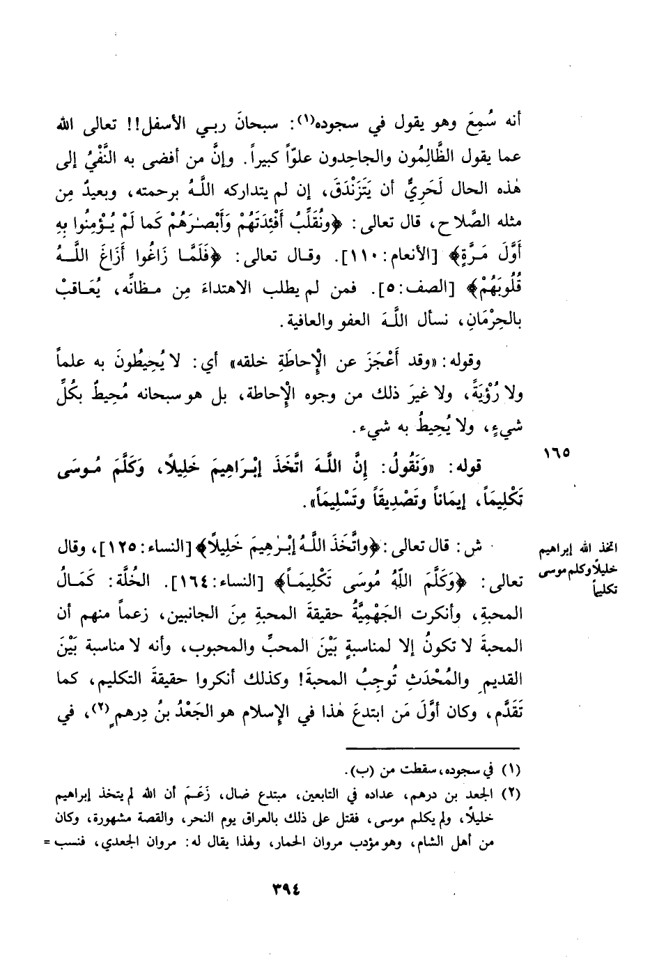 أَنَّهُ سُمِعَ وَهُوَ يَقُولُ فِي سُجُودِهِ: سُبْحَانَ رَبِّيَ الْأَسْفَلِ! ! تَعَالَى اللَّهُ عَمَّا يَقُولُ الظَّالِمُونَ وَالْجَاحِدُونَ عُلُوًّا كَبِيرًا. وَإِنَّ مَنْ أَفْضَى بِهِ النَّفْيُ إِلَى هَذِهِ الْحَالِ حَرِيٌّ أَنَ يَتَزَنْدَقَ، إِنْ لَمْ يَتَدَارَكْهُ اللَّهُ بِرَحْمَتِهِ، وَبَعِيدٌ مِنْ مِثْلِهِ الصَّلَاحُ، قَالَ تَعَالَى: {وَنُقَلِّبُ أَفْئِدَتَهُمْ وَأَبْصَارَهُمْ كَمَا لَمْ يُؤْمِنُوا بِهِ أَوَّلَ مَرَّةٍ} [الْأَنْعَامِ: 110] . وَقَالَ تَعَالَى: {فَلَمَّا زَاغُوا أَزَاغَ اللَّهُ قُلُوبَهُمْ} [الصَّفِّ: 5] . فَمَنْ لَمْ يَطْلُبْ الِاهْتِدَاءَ مِنْ مَظَانِّهِ يُعَاقَبْ بِالْحِرْمَانِ. نَسْأَلُ اللَّهَ الْعَفْوَ وَالْعَافِيَةَ.
