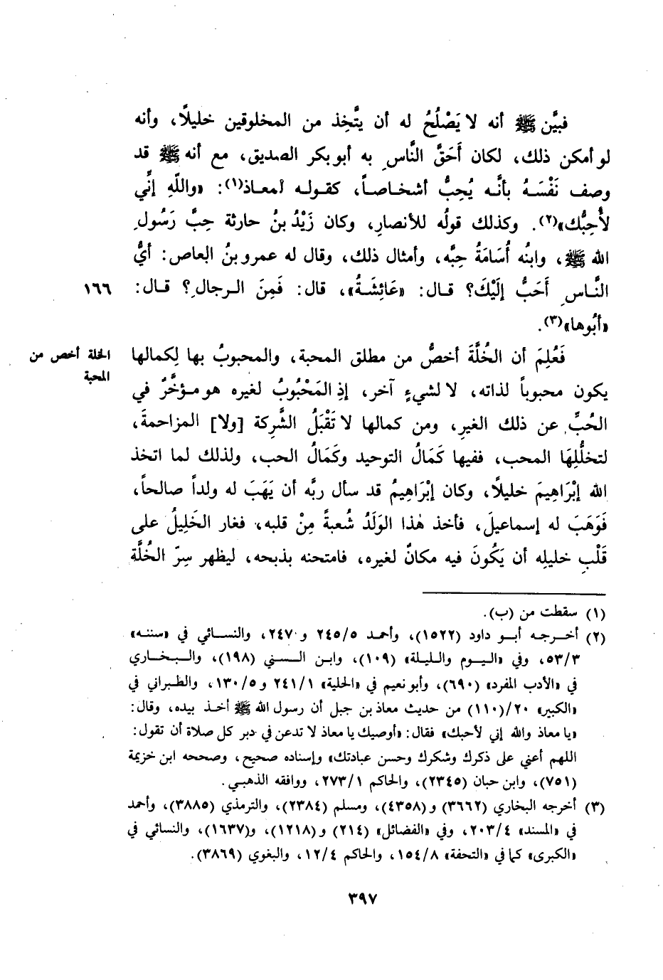 فَعُلِمَ أَنَّ الْخُلَّةَ أَخَصُّ مِنْ مُطْلَقِ الْمَحَبَّةِ، وَالْمَحْبُوبُ بِهَا لِكَمَالِهَا يَكُونُ مُحِبًّا لِذَاتِهِ، لَا لِشَيْءٍ آخَرَ، إِذِ الْمَحْبُوبُ لِغَيْرِهِ هُوَ مُؤَخَّرٌ فِي الْحُبِّ عَنْ ذَلِكَ الْغَيْرِ، وَمِنْ كَمَالِهَا لَا تَقْبَلُ الشَّرِكَةَ [وَلَا] الْمُزَاحَمَةَ، لِتَخَلُّلِهَا الْمُحِبَّ، فَفِيهَا كَمَالُ التَّوْحِيدِ وَكَمَالُ الْحُبِّ. وَلِذَلِكَ لَمَّا اتَّخَذَ اللَّهُ إِبْرَاهِيمَ خَلِيلًا، وَكَانَ إِبْرَاهِيمُ قَدْ سَأَلَ رَبَّهُ أَنْ يَهَبَ لَهُ وَلَدًا صَالِحًا، فَوَهَبَ لَهُ إِسْمَاعِيلَ، فَأَخَذَ هَذَا الْوَلَدُ شُعْبَةً مِنْ قَلْبِهِ، فَغَارَ الْخَلِيلُ عَلَى قَلْبِ خَلِيلِهِ أِنْ يَكُونَ فِيهِ مَكَانٌ لِغَيْرِهِ، فَامْتَحَنَهُ بِهِ بِذَبْحِهِ، لِيَظْهَرَ سِرُّ الْخُلَّةِ