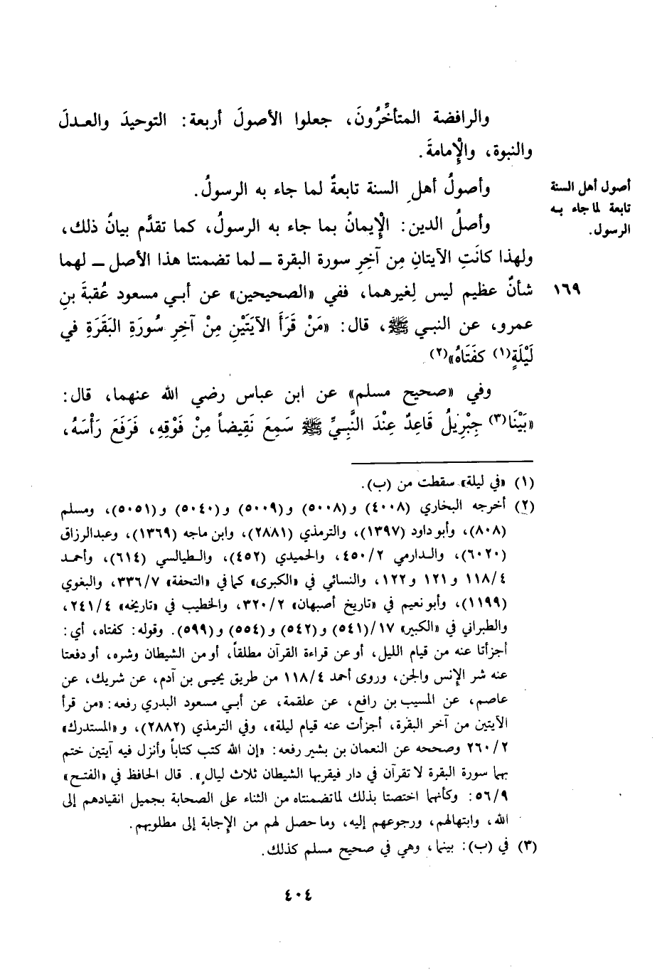 وَأَصْلُ الدِّينِ: الْإِيمَانُ بِمَا جَاءَ بِهِ الرَّسُولُ، كَمَا تَقَدَّمَ بَيَانُ ذَلِكَ، وَلِهَذَا كَانَتِ الْآيَتَانِ مِنْ آخِرِ سُورَةِ الْبَقَرَةِ - لَمَّا تَضَمَّنَتَا هَذَا الْأَصْلَ -: لَهُمَا شَأْنٌ عَظِيمٌ لَيْسَ لِغَيْرِهِمَا، فَفِي ((الصَّحِيحَيْنِ)) عَنْ أَبِي مَسْعُودٍ عُقْبَةَ بْنِ عَمْرٍو، عَنِ النَّبِيِّ صَلَّى اللَّهُ عَلَيْهِ وَسَلَّمَ، قَالَ: «مَنْ قَرَأَ الْآيَتَيْنِ مِنْ آخِرِ سُورَةِ الْبَقَرَةِ فِي لَيْلَةٍ كَفَتَاهُ» .