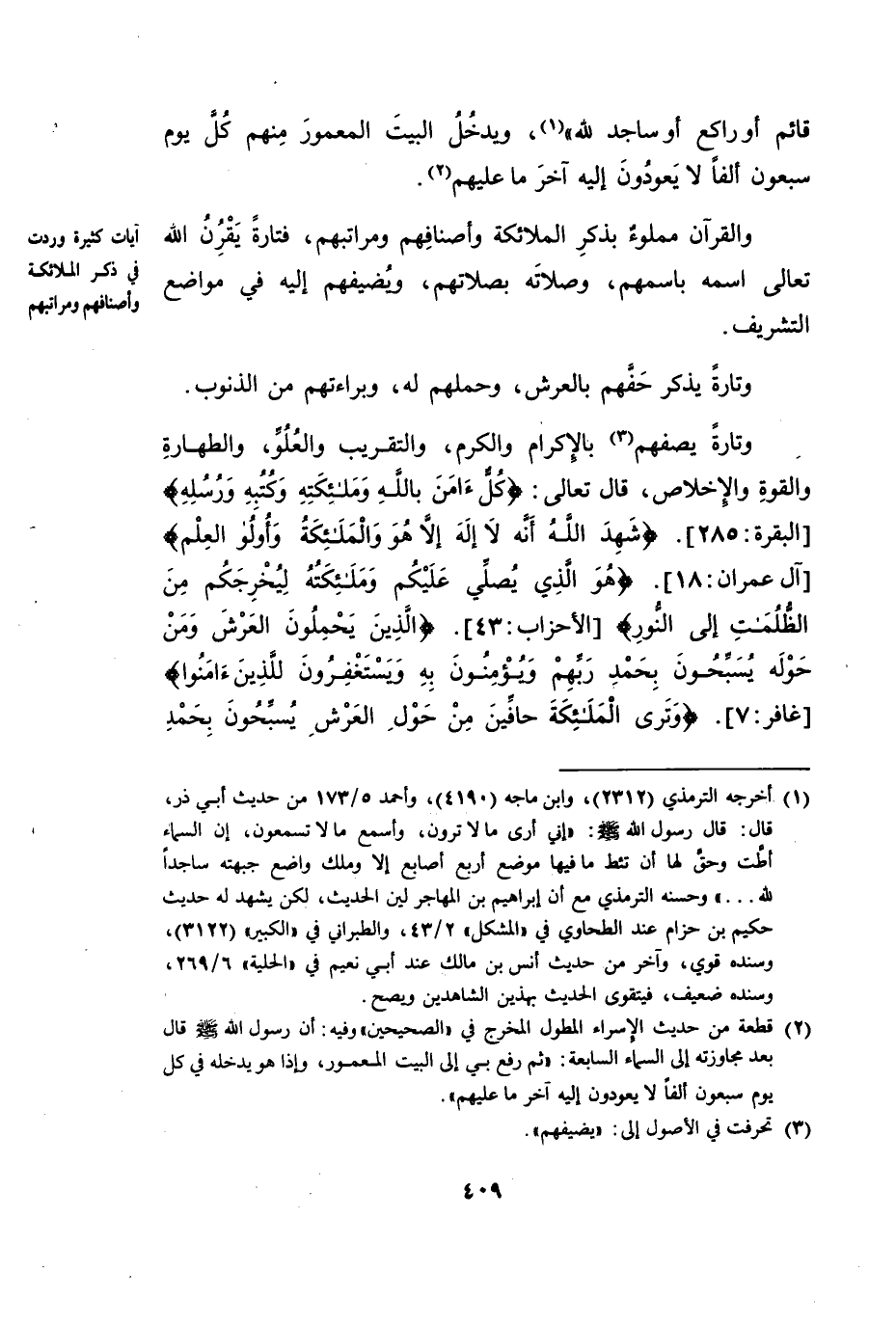 وَتَارَةً يَذْكُرُ حَفَّهُمْ بِالْعَرْشِ وَحَمْلَهُمْ لَهُ، وَبَرَاءَتَهُمْ مِنَ الذُّنُوبِ، وَتَارَةً يَصِفُهُمْ بِالْإِكْرَامِ وَالْكَرَمِ، وَالتَّقْرِيبِ وَالْعُلُوِّ وَالطَّهَارَةِ وَالْقُوَّةِ وَالْإِخْلَاصِ. قَالَ تَعَالَى: {كُلٌّ آمَنَ بِاللَّهِ وَمَلَائِكَتِهِ وَكُتُبِهِ وَرُسُلِهِ} [الْبَقَرَةِ: 285] . {شَهِدَ اللَّهُ أَنَّهُ لَا إِلَهَ إِلَّا هُوَ وَالْمَلَائِكَةُ وَأُولُو الْعِلْمِ} [آلِ عِمْرَانَ: 18] . {هُوَ الَّذِي يُصَلِّي عَلَيْكُمْ وَمَلَائِكَتُهُ لِيُخْرِجَكُمْ مِنَ الظُّلُمَاتِ إِلَى النُّورِ} [الْأَحْزَابِ: 43] . {الَّذِينَ يَحْمِلُونَ الْعَرْشَ وَمَنْ حَوْلَهُ يُسَبِّحُونَ بِحَمْدِ رَبِّهِمْ وَيُؤْمِنُونَ بِهِ وَيَسْتَغْفِرُونَ لِلَّذِينَ آمَنُوا} [غَافِرٍ: 7] . {وَتَرَى الْمَلَائِكَةَ حَافِّينَ مِنْ حَوْلِ الْعَرْشِ يُسَبِّحُونَ بِحَمْدِ رَبِّهِمْ} [الزمر: 75]