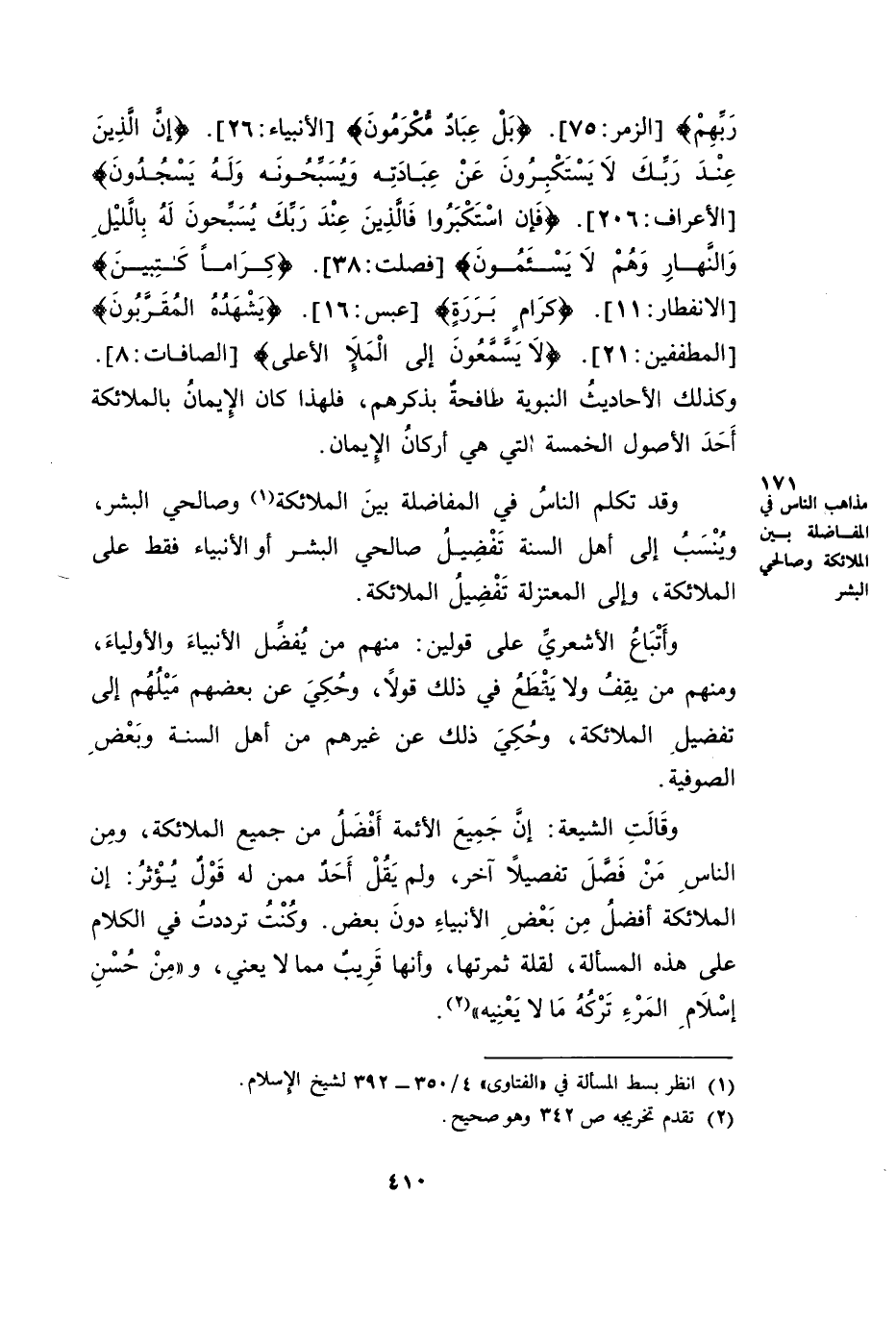 وَقَالَتِ الشِّيعَةُ: إِنَّ جَمِيعَ الْأَئِمَّةِ أَفْضَلُ مِنْ جَمِيعِ الْمَلَائِكَةِ. وَمِنَ النَّاسِ مَنْ فَصَّلَ تَفْصِيلًا آخَرَ. وَلَمْ يَقُلْ أَحَدٌ مِمَّنْ لَهُ قَوْلٌ يُؤْثَرُ إِنَّ الْمَلَائِكَةَ أَفْضَلُ مِنْ بَعْضِ الْأَنْبِيَاءِ دُونَ بَعْضٍ. وَكُنْتُ تَرَدَّدْتُ فِي الْكَلَامِ عَلَى هَذِهِ الْمَسْأَلَةِ، لِقِلَّةِ ثَمَرَتِهَا، وَأَنَّهَا قَرِيبٌ مِمَّا لَا يَعْنِي، وَ «مِنْ حُسْنِ إِسْلَامِ الْمَرْءِ تَرَكُهُ مَا لَا يَعْنِيهِ» .