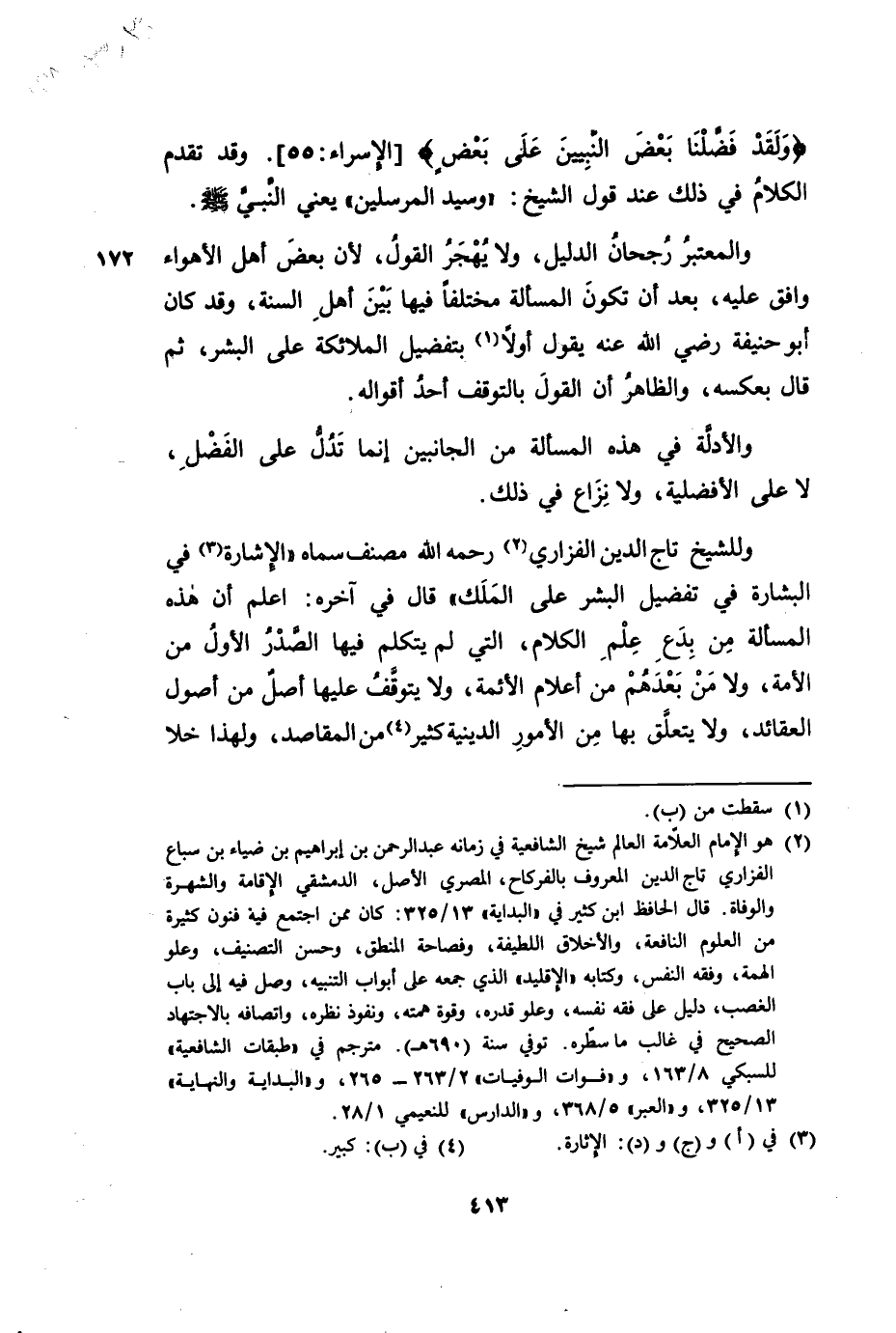 وَلِلشَّيْخِ تَاجِ الدِّينِ الْفَزَارِيِّ رَحِمَهُ اللَّهُ مُصَنَّفٌ سَمَّاهُ الْإِشَارَةَ فِي الْبِشَارَةِ فِي تَفْضِيلِ الْبَشَرِ عَلَى الْمَلَكِ، قَالَ فِي آخِرِهِ: اعْلَمْ أَنَّ هَذِهِ الْمَسْأَلَةَ مِنْ بِدَعِ عِلْمِ الْكَلَامِ، الَّتِي لَمْ يَتَكَلَّمْ فِيهَا الصَّدْرُ الْأَوَّلُ مِنَ الْأُمَّةِ، وَلَا مَنْ بَعْدَهُمْ مِنْ أَعْلَامِ الْأَئِمَّةِ، وَلَا يَتَوَقَّفُ عَلَيْهَا أَصْلٌ مِنْ أَصُولِ الْعَقَائِدِ، وَلَا يَتَعَلَّقُ بِهَا مِنَ الْأُمُورِ الدِّينِيَّةِ كَثِيرٌ مِنَ الْمَقَاصِدِ. وَلِهَذَا خَلَا