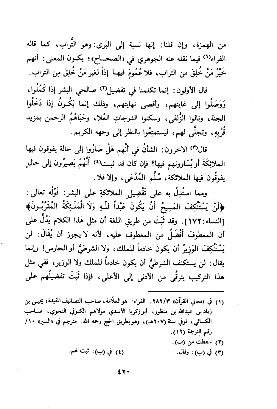 وَمِمَّا اسْتُدِلَّ بِهِ عَلَى تَفْضِيلِ الْمَلَائِكَةِ عَلَى الْبَشَرِ: قَوْلُهُ تَعَالَى: {لَنْ يَسْتَنْكِفَ الْمَسِيحُ أَنْ يَكُونَ عَبْدًا لِلَّهِ وَلَا الْمَلَائِكَةُ الْمُقَرَّبُونَ} [النِّسَاءِ: 172] . وَقَدْ ثَبَتَ مِنْ طَرِيقِ اللُّغَةِ أَنَّ مِثْلَ هَذَا الْكَلَامِ يَدُلُّ عَلَى أَنَّ الْمَعْطُوفَ أَفْضَلُ مِنَ الْمَعْطُوفِ عَلَيْهِ، لِأَنَّهُ لَا يَجُوزُ أَنْ يُقَالَ: لَنْ يَسْتَنْكِفَ الْوَزِيرُ أَنْ يَكُونَ خَادِمًا لِلْمَلِكِ، وَلَا الشُّرْطِيُّ أَوِ الْحَارِسُ! وَإِنَّمَا يُقَالُ: لَنْ يَسْتَنْكِفَ الشُّرْطِيُّ أَنْ يَكُونَ خَادِمًا لِلْمَلِكِ وَلَا الْوَزِيرُ. فَفِي مِثْلِ هَذَا التَّرْكِيبِ يَتَرَقَّى مِنَ الْأَدْنَى إِلَى الْأَعْلَى، فَإِذَا ثَبَتَ تَفْضِيلُهُمْ عَلَى