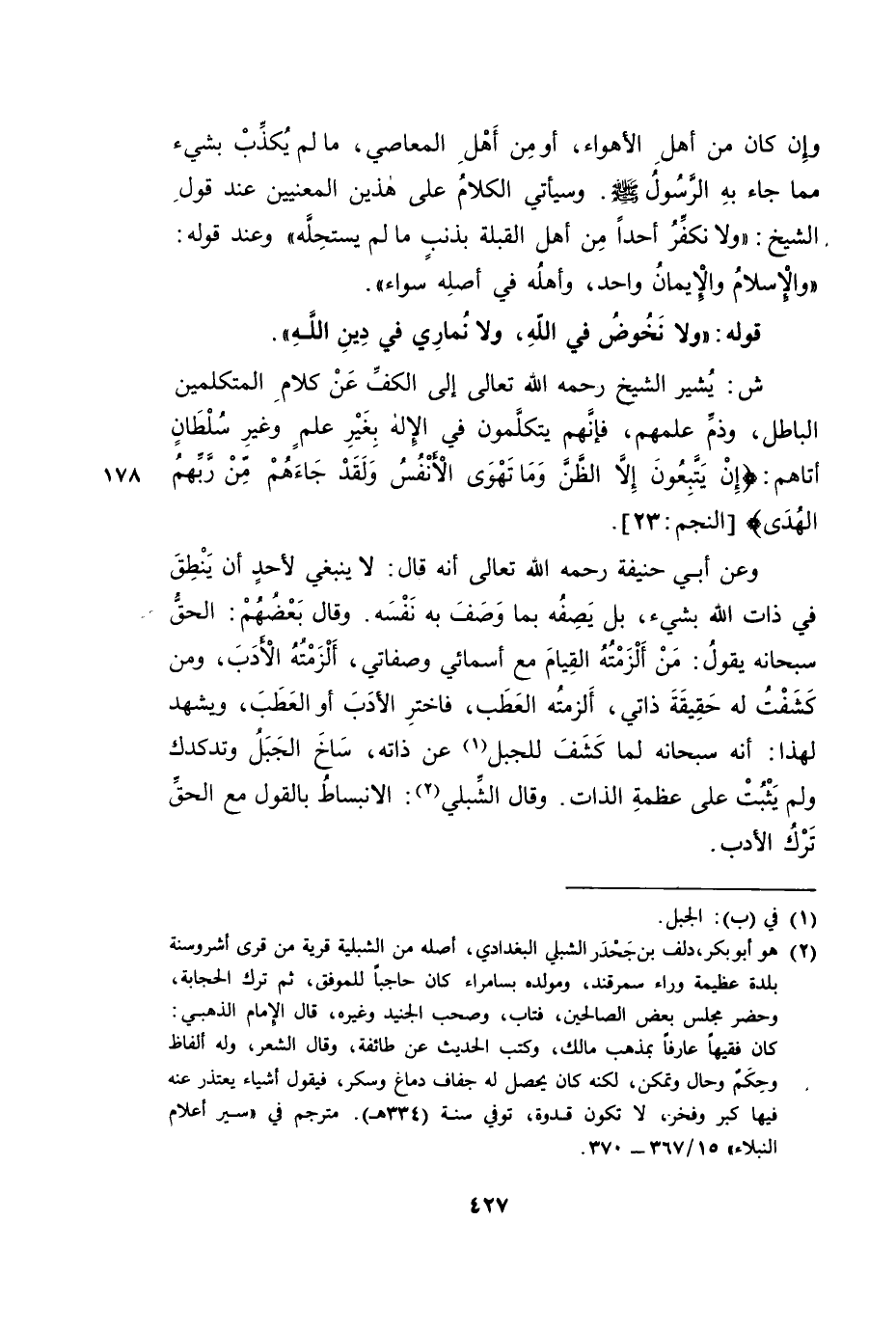 وَعَنْ أَبِي حَنِيفَةَ رَحِمَهُ اللَّهُ، أَنَّهُ قَالَ: لَا يَنْبَغِي لِأَحَدٍ أَنْ يَنْطِقَ فِي ذَاتِ اللَّهِ بِشَيْءٍ، بَلْ يَصِفُهُ بِمَا وَصَفَ بِهِ نَفْسَهُ. وَقَالَ بَعْضُهُمُ: الْحَقُّ سُبْحَانَهُ يَقُولُ: مَنْ أَلْزَمْتُهُ الْقِيَامَ مَعَ أَسْمَائِي وَصِفَاتِي أَلْزَمْتُهُ الْأَدَبَ، وَمَنْ كَشَفْتُ لَهُ حَقِيقَةَ ذَاتِي أَلْزَمْتُهُ الْعَطَبَ، فَاخْتَرِ الْأَدَبَ أَوِ الْعَطَبَ. وَيَشْهَدُ لِهَذَا: أَنَّهُ سُبْحَانَهُ لَمَّا كَشَفَ لِلْجَبَلِ عَنْ ذَاتِهِ سَاخَ الْجَبَلُ وَتَدَكْدَكَ وَلَمْ يَثْبُتْ عَلَى عَظَمَةِ الذَّاتِ. قَالَ الشِّبْلِيُّ: الِانْبِسَاطُ بِالْقَوْلِ مَعَ الْحَقِّ تَرْكُ الْأَدَبِ.
