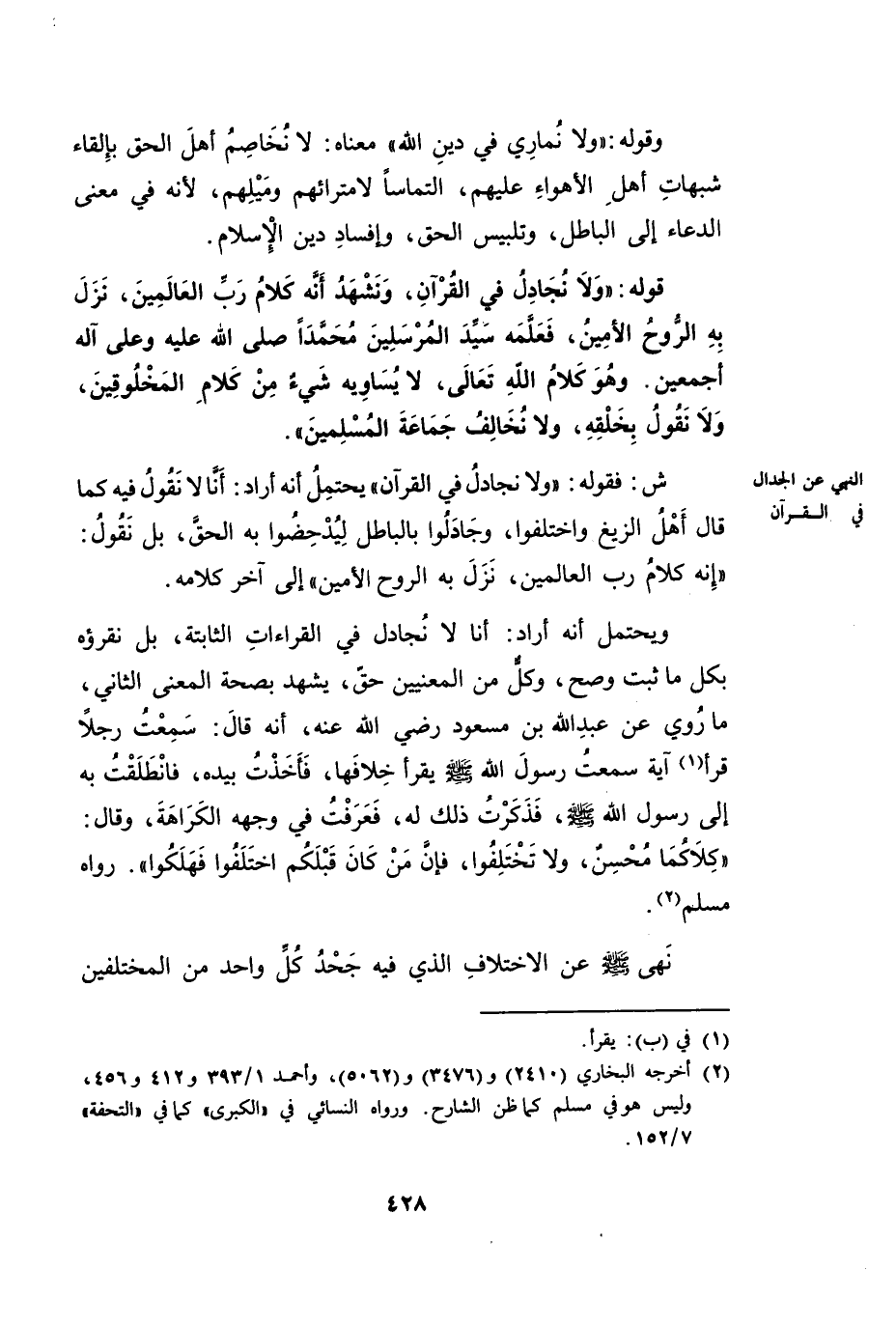 وَيَحْتَمِلُ أَنَّهُ أَرَادَ: أَنَّا لَا نُجَادِلُ فِي الْقِرَاءَةِ الثَّابِتَةِ، بَلْ نَقْرَؤُهُ بِكُلِّ مَا ثَبَتَ وَصَحَّ. وَكُلٌّ مِنَ الْمَعْنَيَيْنِ حَقٌّ. يَشْهَدُ بِصِحَّةِ الْمَعْنَى الثَّانِي، مَا رُوِيَ عَنْ عَبْدِ اللَّهِ بْنِ مَسْعُودٍ رَضِيَ اللَّهُ عَنْهُ، أَنَّهُ قَالَ: «سَمِعْتُ رَجُلًا قَرَأَ آيَةً سَمِعْتُ رَسُولَ اللَّهِ صَلَّى اللَّهُ عَلَيْهِ وَسَلَّمَ يَقْرَأُ خِلَافَهَا، فَأَخَذْتُ بِيَدِهِ، فَانْطَلَقْتُ بِهِ إِلَى رَسُولِ اللَّهِ صَلَّى اللَّهُ عَلَيْهِ وَسَلَّمَ، فَذَكَرْتُ ذَلِكَ لَهُ، فَعَرَفْتُ فِي وَجْهِهِ الْكَرَاهَةَ، وَقَالَ: كِلَاكُمَا مُحْسِنٌ، لَا تَخْتَلِفُوا، فَإِنَّ مَنْ كَانَ قَبْلَكُمُ اخْتَلَفُوا فَهَلَكُوا» رَوَاهُ مُسْلِمٌ.