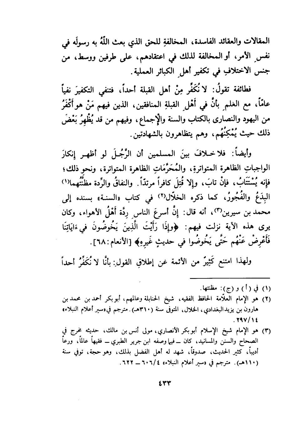 وَأَيْضًا: فَلَا خِلَافَ بَيْنَ الْمُسْلِمِينَ أَنَّ الرَّجُلَ لَوْ أَظْهَرَ إِنْكَارَ الْوَاجِبَاتِ الظَّاهِرَةِ الْمُتَوَاتِرَةِ، وَالْمُحَرَّمَاتِ الظَّاهِرَةِ الْمُتَوَاتِرَةِ، وَنَحْوِ ذَلِكَ، فَإِنَّهُ يُسْتَتَابُ، فَإِنْ تَابَ، وَإِلَّا قُتِلَ كَافِرًا مُرْتَدًّا. وَالنِّفَاقُ وَالرِّدَّةُ مَظِنَّتُهُمَا الْبِدَعُ وَالْفُجُورُ، كَمَا ذَكَرَهُ الْخَلَّالُ فِي كِتَابِ السُّنَّةِ، بِسَنَدِهِ إِلَى مُحَمَّدِ بْنِ سِيرِينَ، أَنَّهُ قَالَ: إِنَّ أَسْرَعَ النَّاسِ رِدَّةً أَهْلُ الْأَهْوَاءِ، وَكَانَ يَرَى هَذِهِ الْآيَةَ نَزَلَتْ فِيهِمْ: {وَإِذَا رَأَيْتَ الَّذِينَ يَخُوضُونَ فِي آيَاتِنَا فَأَعْرِضْ عَنْهُمْ حَتَّى يَخُوضُوا فِي حَدِيثٍ غَيْرِهِ} [الْأَنْعَامِ: 68] .