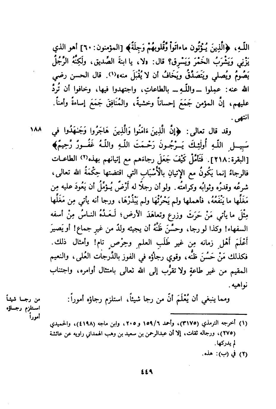 وَمِمَّا يَنْبَغِي أَنْ يُعْلَمَ أَنَّ مَنْ رَجَا شَيْئًا اسْتَلْزَمَ رَجَاؤُهُ أُمُورًا: