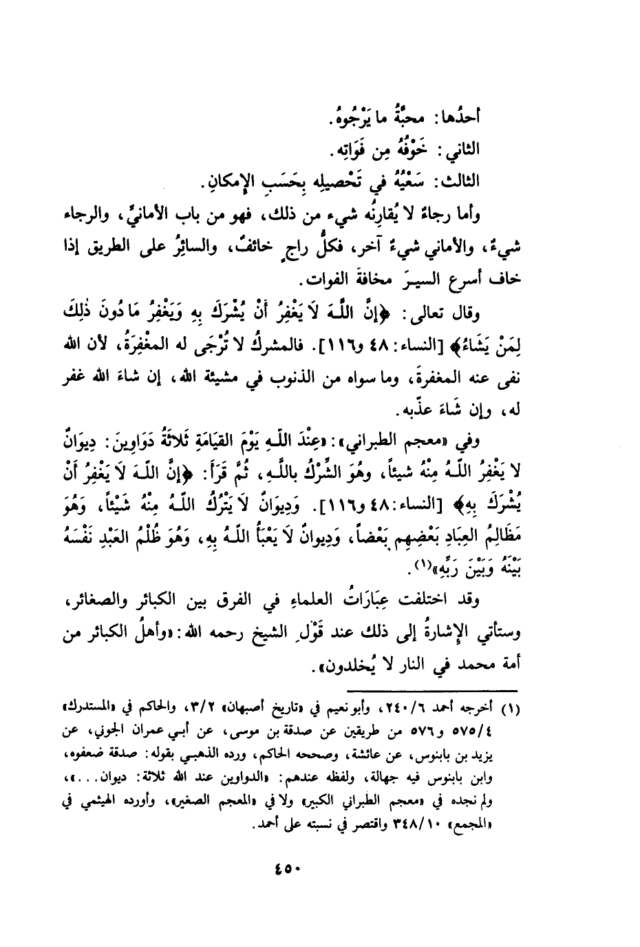 وَفِي مُعْجَمِ الطَّبَرَانِيِّ: عِنْدَ اللَّهِ يَوْمَ الْقِيَامَةِ ثَلَاثَةُ دَوَاوِينَ: دِيوَانٌ لَا يَغْفِرُ اللَّهُ مِنْهُ شَيْئًا، وَهُوَ الشِّرْكُ بِاللَّهِ، ثُمَّ قَرَأَ: {إِنَّ اللَّهَ لَا يَغْفِرُ أَنْ يُشْرَكَ بِهِ} [النساء: 48]