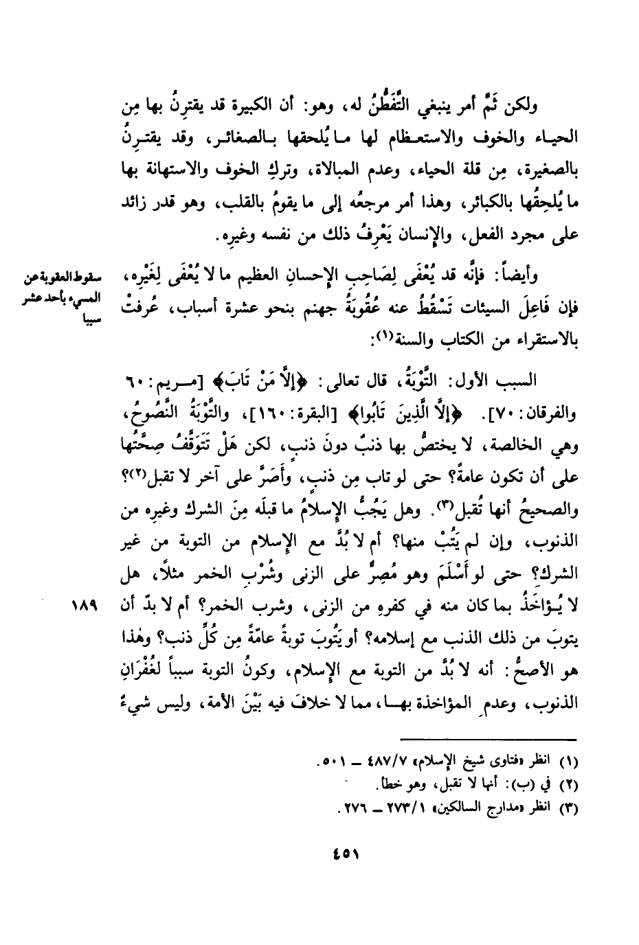 [الْبَقَرَةِ: 160] . وَالتَّوْبَةُ النَّصُوحُ، وَهِيَ الْخَالِصَةُ، لَا يَخْتَصُّ بِهَا ذَنْبٌ دُونَ ذَنْبٍ، لَكِنْ هَلْ تَتَوَقَّفُ صِحَّتُهَا عَلَى أَنْ تَكُونَ عَامَّةً؟ حَتَّى لَوْ تَابَ مِنْ ذَنْبٍ وَأَصَرَّ عَلَى آخَرَ لَا تُقْبَلُ؟ وَالصَّحِيحُ أَنَّهَا تُقْبَلُ. وَهَلْ يَجُبُّ الْإِسْلَامُ مَا قَبْلَهُ مِنَ الشِّرْكِ وَغَيْرِهِ مِنَ الذُّنُوبِ وَإِنْ لَمْ يَتُبْ مِنْهَا؟ أَمْ لَا بُدَّ مَعَ الْإِسْلَامِ مِنَ التَّوْبَةِ مِنْ غَيْرِ الشِّرْكِ؟ حَتَّى لَوْ أَسْلَمَ وَهُوَ مُصِرٌّ عَلَى الزِّنَا وَشُرْبِ الْخَمْرِ مَثَلًا، هَلْ يُؤَاخَذُ بِمَا كَانَ مِنْهُ فِي كُفْرِهِ مِنَ الزِّنَا وَشُرْبِ الْخَمْرِ؟ أَمْ لَا بُدَّ أَنْ يَتُوبَ مِنْ ذَلِكَ الذَّنْبِ مَعَ إِسْلَامِهِ؟ أَوْ يَتُوبَ تَوْبَةً عَامَّةً مِنْ كُلِّ ذَنْبٍ؟ وَهَذَا هُوَ الْأَصَحُّ: أَنَّهُ لَا بُدَّ مِنَ التَّوْبَةِ مَعَ الْإِسْلَامِ، وَكَوْنُ التَّوْبَةِ سَبَبًا لِغُفْرَانِ الذُّنُوبِ وَعَدَمِ الْمُؤَاخَذَةِ بِهَا - مِمَّا لَا خِلَافَ فِيهِ بَيْنَ الْأُمَّةِ، وَلَيْسَ شَيْءٌ