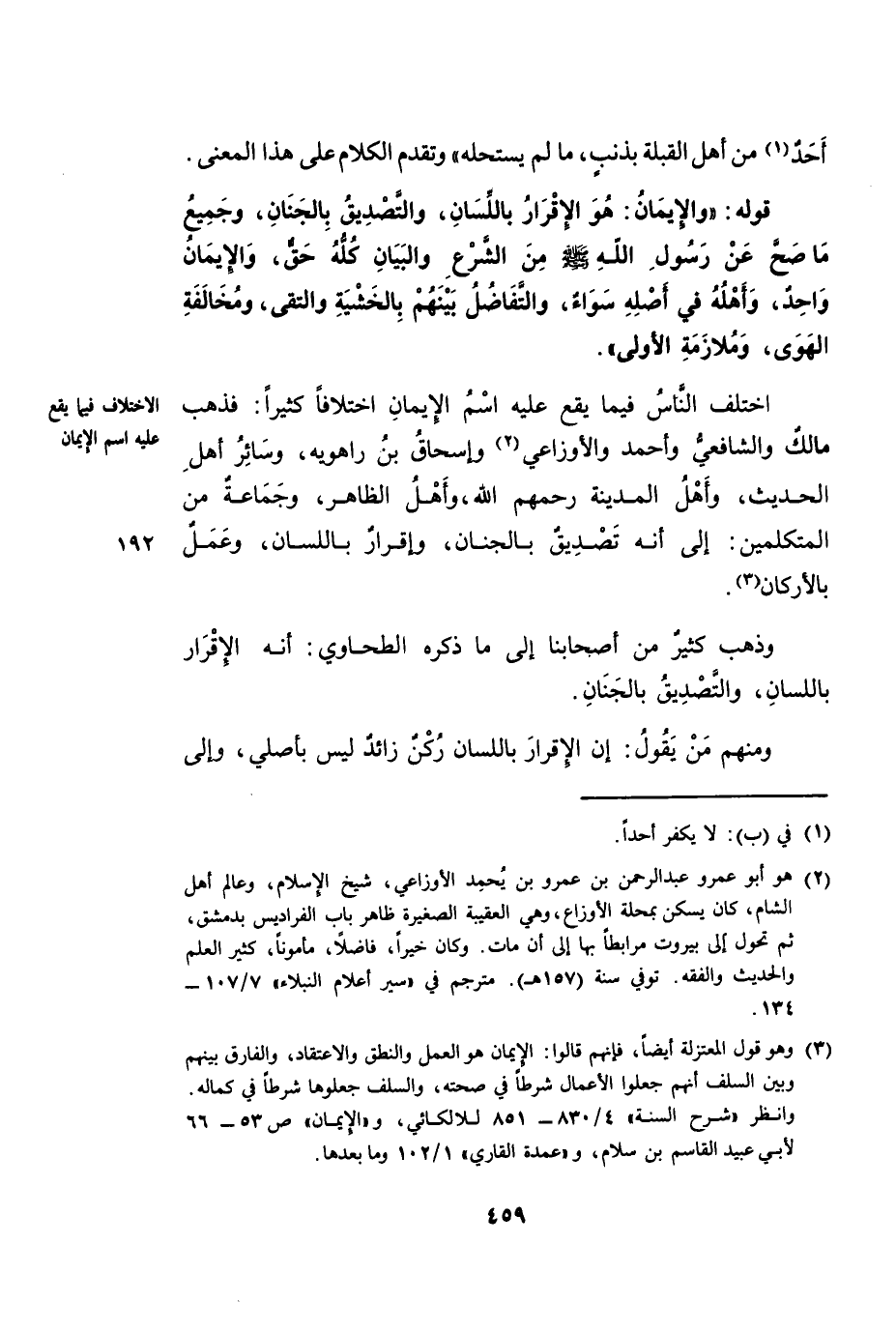 ش: اخْتَلَفَ النَّاسُ فِيمَا يَقَعُ عَلَيْهِ اسْمُ الْإِيمَانِ، اخْتِلَافًا كَثِيرًا: فَذَهَبَ مَالِكٌ وَالشَّافِعِيُّ وَأَحْمَدُ وَالْأَوْزَاعِيُّ وَإِسْحَاقُ بْنُ رَاهَوَيْهِ وَسَائِرُ أَهْلِ الْحَدِيثِ، وَأَهْلُ الْمَدِينَةِ رَحِمَهُمُ اللَّهُ، وَأَهْلُ الظَّاهِرِ، وَجَمَاعَةٌ مِنَ الْمُتَكَلِّمِينَ: إِلَى أَنَّهُ تَصْدِيقٌ بِالْجَنَانِ، وَإِقْرَارٌ بِاللِّسَانِ، وَعَمَلٌ بِالْأَرْكَانِ.