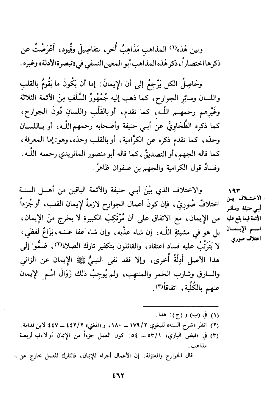 وَالِاخْتِلَافُ الَّذِي بَيْنَ أَبِي حَنِيفَةَ وَالْأَئِمَّةِ الْبَاقِينَ مِنْ أَهْلِ السُّنَّةِ - اخْتِلَافٌ صُورِيٌّ. فَإِنَّ كَوْنَ أَعْمَالِ الْجَوَارِحِ لَازِمَةً لِإِيمَانِ الْقَلْبِ، أَوْ جُزْءًا مِنَ الْإِيمَانِ، مَعَ الِاتِّفَاقِ عَلَى أَنَّ مُرْتَكِبَ الْكَبِيرَةِ لَا يَخْرُجُ مِنَ الْإِيمَانِ، بَلْ هُوَ فِي مَشِيئَةِ اللَّهِ، إِنْ شَاءَ عَذَّبَهُ، وَإِنْ شَاءَ عَفَا عَنْهُ -: نِزَاعٌ لَفْظِيٌّ، لَا يَتَرَتَّبُ عَلَيْهِ فَسَادُ اعْتِقَادٍ. وَالْقَائِلُونَ بِتَكْفِيرِ تَارِكِ الصَّلَاةِ، ضَمُّوا إِلَى هَذَا الْأَصْلِ أَدِلَّةً أُخْرَى. وَإِلَّا فَقَدَ نَفَى النَّبِيُّ صَلَّى اللَّهُ عَلَيْهِ وَسَلَّمَ الْإِيمَانَ عَنِ الزَّانِي وَالسَّارِقِ وَشَارِبِ الْخَمْرِ وَالْمُنْتَهِبِ، وَلَمْ يُوجِبْ ذَلِكَ زَوَالَ اسْمِ الْإِيمَانِ عَنْهُمْ بِالْكُلِّيَّةِ، اتِّفَاقًا.