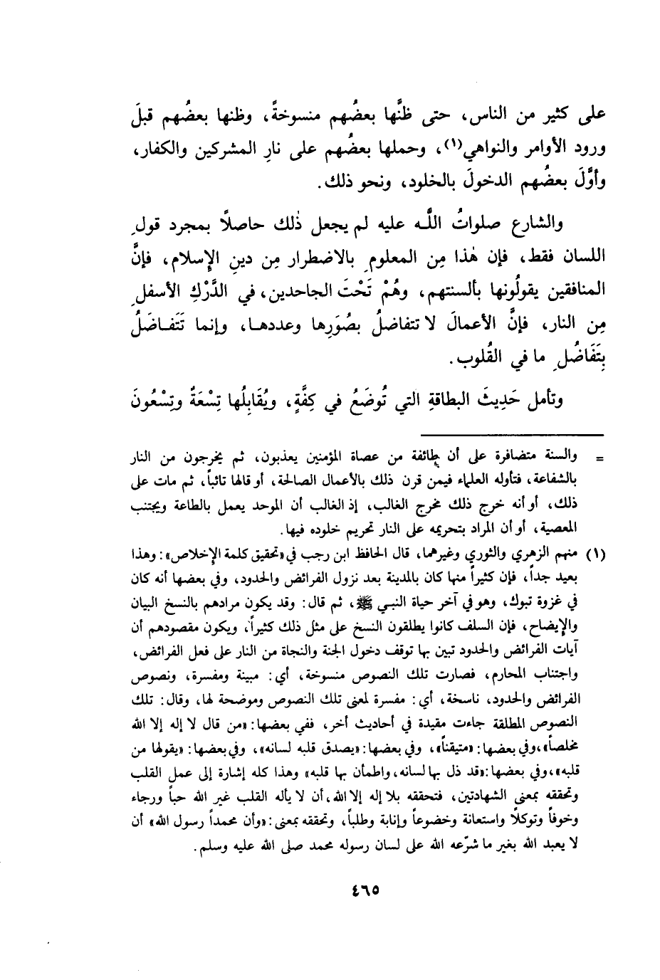 وَالشَّارِعُ صَلَوَاتُ اللَّهِ وَسَلَامُهُ عَلَيْهِ لَمْ يَجْعَلْ ذَلِكَ حَاصِلًا بِمُجَرَّدِ قَوْلِ اللِّسَانِ فَقَطْ، فَإِنَّ هَذَا مِنَ الْمَعْلُومِ بِالِاضْطِرَارِ مِنْ دِينِ الْإِسْلَامِ، فَإِنَّ الْمُنَافِقِينَ يَقُولُونَهَا بِأَلْسِنَتِهِمْ، وَهُمْ تَحْتَ الْجَاحِدِينَ فِي الدَّرْكِ الْأَسْفَلِ مِنَ النَّارِ، فَإِنَّ الْأَعْمَالَ لَا تَتَفَاضَلُ بِصُوَرِهَا وَعَدَدِهَا، وَإِنَّمَا تَتَفَاضَلُ بِتَفَاضُلِ مَا فِي الْقُلُوبِ.