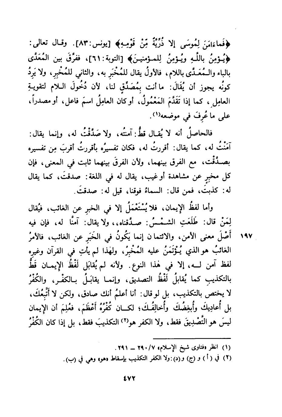 وَأَمَّا لَفْظُ الْإِيمَانِ فَلَا يُسْتَعْمَلُ إِلَّا فِي الْخَبَرِ عَنِ الْغَائِبِ، فَيُقَالُ لِمَنْ قَالَ: طَلَعَتِ الشَّمْسُ -: صَدَّقْنَاهُ، وَلَا يُقَالُ: آمَنَّا لَهُ، فَإِنَّ فِيهِ أَصْلَ مَعْنَى الْأَمْنِ، وَالِائْتِمَانُ إِنَّمَا يَكُونُ فِي الْخَبَرِ عَنِ الْغَائِبِ، فَالْأَمْرُ الْغَائِبُ هُوَ الَّذِي يُؤْتَمَنُ عَلَيْهِ الْمُخْبِرُ. وَلِهَذَا لَمْ يَأْتِ فِي الْقُرْآنِ وَغَيْرِهِ لَفْظُ آمَنَ لَهُ - إِلَّا فِي هَذَا النَّوْعِ. وَلِأَنَّهُ لَمْ يُقَابَلْ لَفْظُ الْإِيمَانِ قَطُّ بِالتَّكْذِيبِ كَمَا يُقَابَلُ لَفْظُ التَّصْدِيقِ، وَإِنَّمَا يُقَابَلُ بِالْكُفْرِ، وَالْكُفْرُ لَا يَخْتَصُّ بِالتَّكْذِيبِ، بَلْ لَوْ قَالَ: أَنَا أَعْلَمُ أَنَّكَ صَادِقٌ وَلَكِنْ لَا أَتَّبِعُكَ، بَلْ أُعَادِيكَ وَأُبْغِضُكَ وَأُخَالِفُكَ -: لَكَانَ كُفْرُهُ أَعْظَمَ، فَعُلِمَ أَنَّ الْإِيمَانَ لَيْسَ هُوَ التَّصْدِيقَ فَقَطْ، وَلَا الْكُفْرُ هُوَ التَّكْذِيبَ فَقَطْ، بَلْ إِذَا كَانَ الْكُفْرُ
