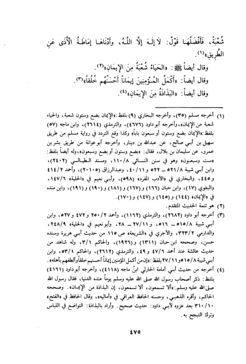 شُعْبَةً، فَأَفْضَلُهَا قَوْلُ: لَا إِلَهَ إِلَّا اللَّهُ، وَأَدْنَاهَا إِمَاطَةُ الْأَذَى عَنِ الطَّرِيقِ» .