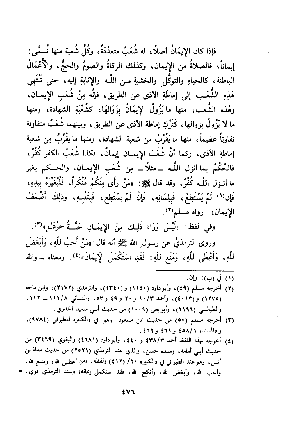 فَإِذَا كَانَ الْإِيمَانُ أَصْلًا لَهُ شُعَبٌ مُتَعَدِّدَةٌ، وَكُلُّ شُعْبَةٍ مِنْهَا تُسَمَّى: إِيمَانًا، فَالصَّلَاةُ مِنَ الْإِيمَانِ، وَكَذَلِكَ الزَّكَاةُ وَالصَّوْمُ وَالْحَجُّ، وَالْأَعْمَالُ الْبَاطِنَةُ، كَالْحَيَاءِ وَالتَّوَكُّلِ وَالْخَشْيَةِ مِنَ اللَّهِ وَالْإِنَابَةِ إِلَيْهِ، حَتَّى تَنْتَهِيَ هَذِهِ الشُّعَبُ إِلَى إِمَاطَةِ الْأَذَى عَنِ الطَّرِيقِ، فَإِنَّهُ مِنْ شُعَبِ الْإِيمَانِ. وَهَذِهِ الشُّعَبُ، مِنْهَا مَا يَزُولُ الْإِيمَانُ بِزَوَالِهَا [إِجْمَاعًا] ، كَشُعْبَةِ الشَّهَادَةِ، وَمِنْهَا مَا لَا يَزُولُ بِزَوَالِهَا، كَتَرْكِ إِمَاطَةِ الْأَذَى عَنِ الطَّرِيقِ، وَبَيْنَهُمَا شُعَبٌ مُتَفَاوِتَةٌ تَفَاوُتًا عَظِيمًا، مِنْهَا مَا يَقْرُبُ مِنْ شُعْبَةِ الشَّهَادَةِ، وَمِنْهَا مَا يَقْرُبُ مِنْ شُعْبَةِ إِمَاطَةِ الْأَذَى. وَكَمَا أَنَّ شُعَبَ الْإِيمَانِ إِيمَانٌ، فَكَذَا شُعَبُ الْكُفْرِ كُفْرٌ، فَالْحُكْمُ بِمَا أَنْزَلَ اللَّهُ - مَثَلًا مِنْ شُعَبِ الْإِيمَانِ، وَالْحُكْمُ بِغَيْرِ مَا أَنْزَلَ اللَّهُ كُفْرٌ. وَقَدْ قَالَ صَلَّى اللَّهُ عَلَيْهِ وَسَلَّمَ: «مَنْ رَأَى مِنْكُمْ مُنْكَرًا فَلْيُغَيِّرْهُ بِيَدِهِ، فَإِنْ لَمْ يَسْتَطِعْ فَبِلِسَانِهِ، فَإِنْ لَمْ يَسْتَطِعْ فَبِقَلْبِهِ، وَذَلِكَ أَضْعَفُ الْإِيمَانِ» . رَوَاهُ مُسْلِمٌ. وَفِي لَفْظٍ: «لَيْسَ وَرَاءَ ذَلِكَ مِنَ الْإِيمَانِ حَبَّةُ خَرْدَلٍ» . وَرَوَى التِّرْمِذِيُّ عَنْ رَسُولِ اللَّهِ صَلَّى اللَّهُ عَلَيْهِ وَسَلَّمَ أَنَّهُ قَالَ: «مَنْ أَحَبَّ لِلَّهِ، وَأَبْغَضَ لِلَّهِ، وَأَعْطَى لِلَّهِ، وَمَنَعَ لِلَّهِ -: فَقَدِ اسْتَكْمَلَ الْإِيمَانَ» . وَمَعْنَاهُ - وَاللَّهُ