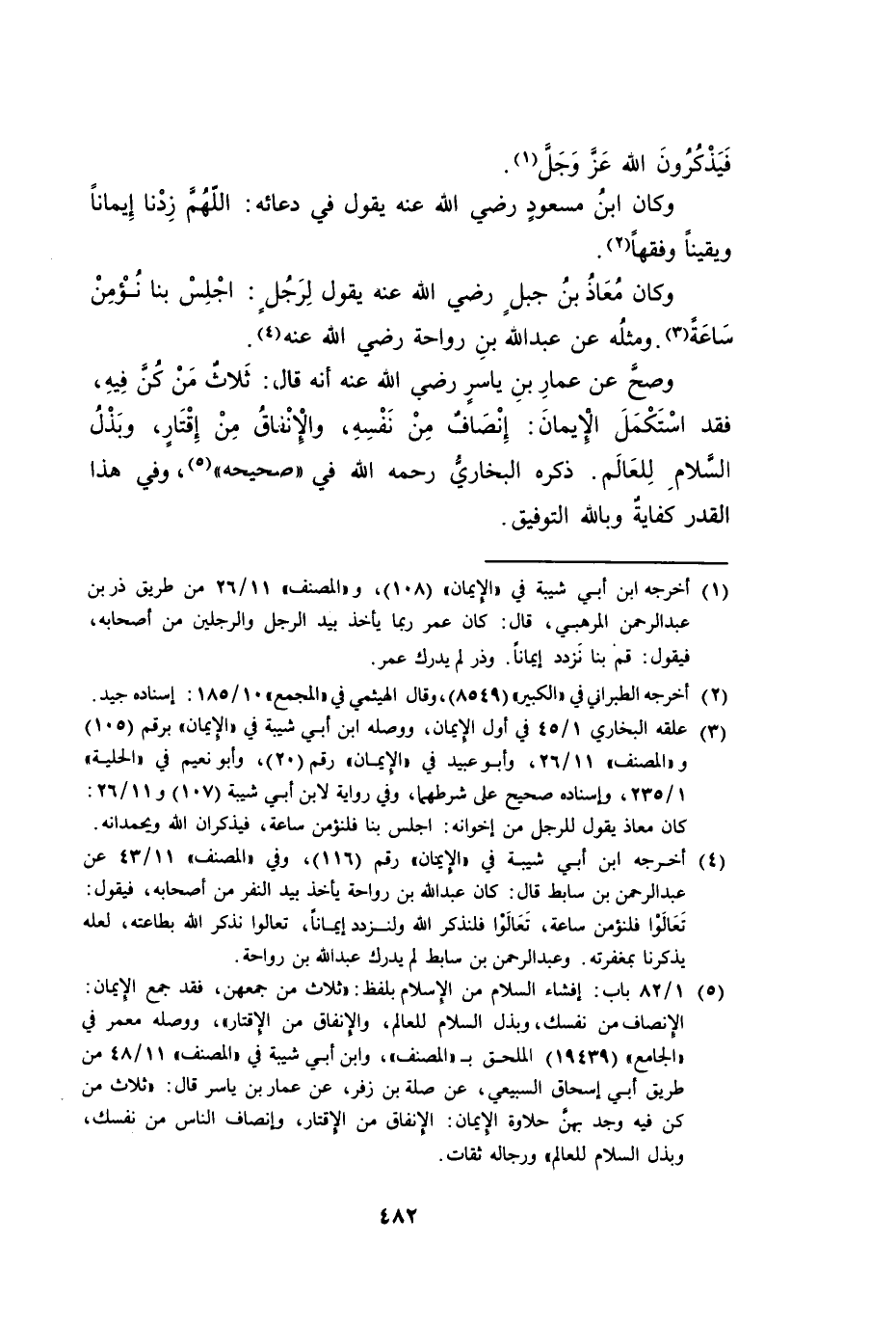 وَصَحَّ عَنْ عَمَّارِ بْنِ يَاسِرٍ رَضِيَ اللَّهُ عَنْهُ أَنَّهُ قَالَ: ثَلَاثٌ مَنْ كُنَّ فِيهِ فَقَدِ اسْتَكْمَلَ الْإِيمَانَ: إِنْصَافٌ مِنْ نَفْسِهِ، وَالْإِنْفَاقُ مِنْ إِقْتَارٍ، وَبَذْلُ السَّلَامِ لِلْعَالَمِ، ذَكَرَهُ الْبُخَارِيُّ رَحِمَهُ اللَّهُ فِي صَحِيحِهِ. وَفِي هَذَا الْمِقْدَارِ كِفَايَةٌ وَبِاللَّهِ التَّوْفِيقُ.