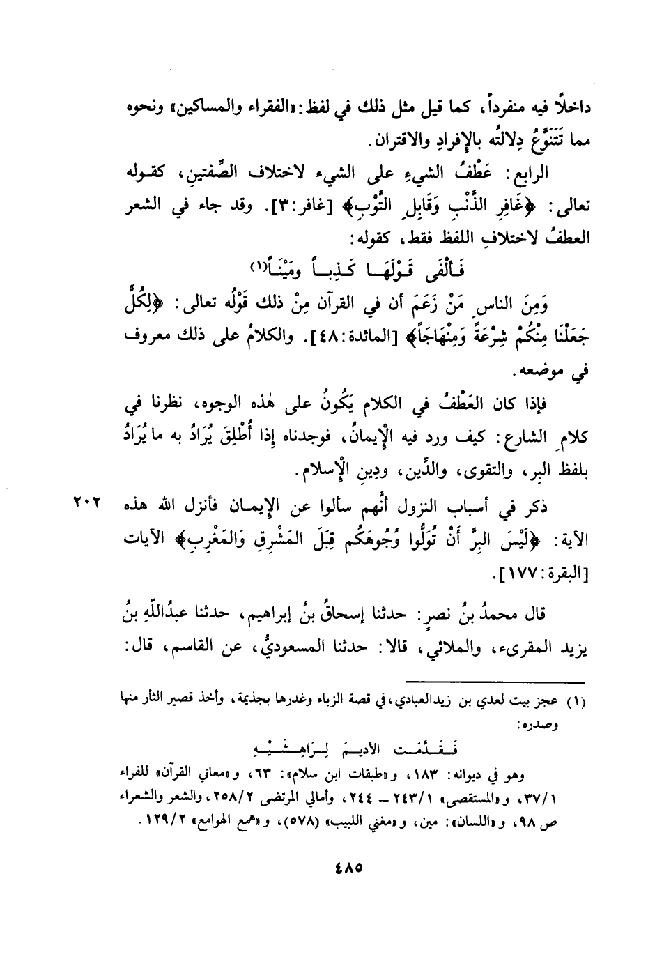 فَإِذَا كَانَ الْعَطْفُ فِي الْكَلَامِ يَكُونُ عَلَى هَذِهِ الْوُجُوهِ، نَظَرْنَا فِي كَلَامِ الشَّارِعِ: كَيْفَ وَرَدَ فِيهِ الْإِيمَانُ فَوَجَدْنَاهُ إِذَا أُطْلِقَ يُرَادُ بِهِ مَا يُرَادُ بِلَفْظِ الْبِرِّ، وَالتَّقْوَى، وَالدِّينِ، وَدِينِ الْإِسْلَامِ.