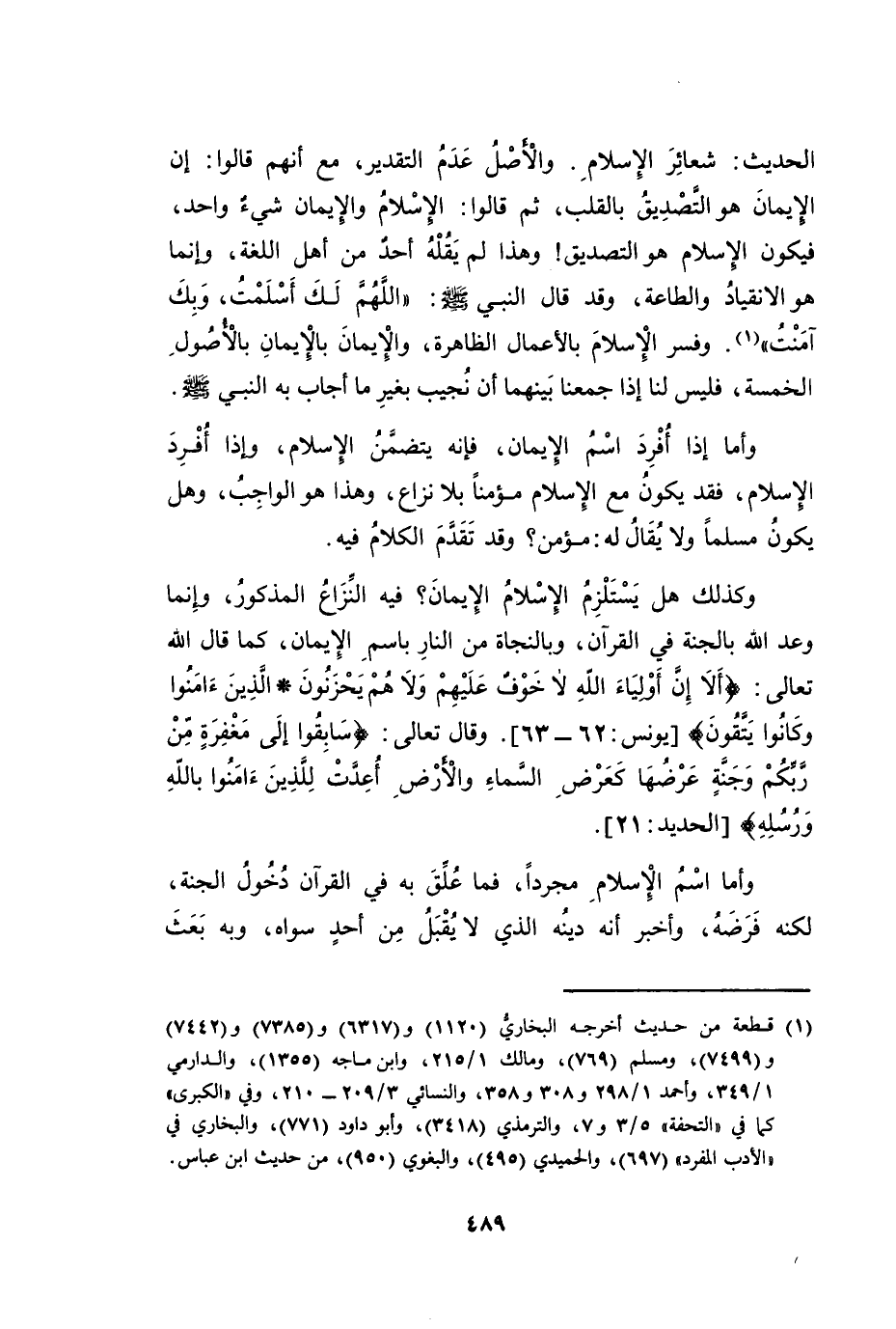 الْحَدِيثَ -: شَعَائِرَ الْإِسْلَامِ. وَالْأَصْلُ عَدَمُ التَّقْدِيرِ، مَعَ أَنَّهُمْ قَالُوا: إِنَّ الْإِيمَانَ هُوَ التَّصْدِيقُ بِالْقَلْبِ، ثُمَّ قَالُوا الْإِسْلَامُ وَالْإِيمَانُ شَيْءٌ وَاحِدٌ، فَيَكُونُ الْإِسْلَامُ هُوَ التَّصْدِيقَ! وَهَذَا لَمْ يَقُلْهُ أَحَدٌ مِنْ أَهْلِ اللُّغَةِ، وَإِنَّمَا هُوَ الِانْقِيَادُ وَالطَّاعَةُ، وَقَدْ قَالَ النَّبِيُّ صَلَّى اللَّهُ عَلَيْهِ وَسَلَّمَ: «اللَّهُمَّ لَكَ أَسْلَمْتُ وَبِكَ آمَنْتُ» . وَفَسَّرَ الْإِسْلَامَ بِالْأَعْمَالِ الظَّاهِرَةِ، وَالْإِيمَانَ بِالْإِيمَانِ بِالْأُصُولِ الْخَمْسَةِ. فَلَيْسَ لَنَا إِذَا جَمَعْنَا بَيْنَهُمَا أَنْ نُجِيبَ بِغَيْرِ مَا أَجَابَ بِهِ النَّبِيُّ صَلَّى اللَّهُ عَلَيْهِ وَسَلَّمَ.