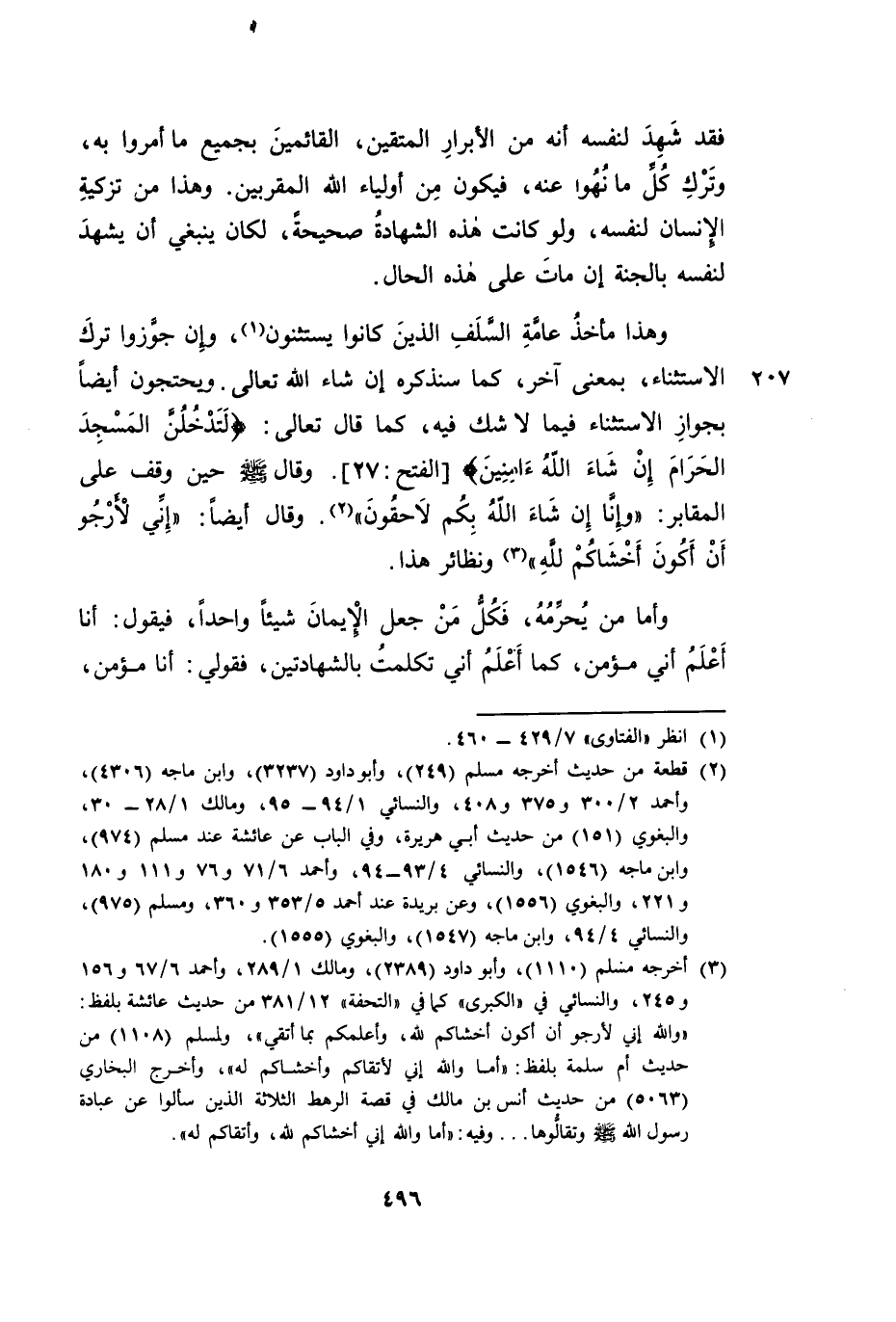 وَهَذَا مَأْخَذُ عَامَّةِ السَّلَفِ الَّذِينَ كَانُوا يَسْتَثْنُونَ، وَإِنْ جَوَّزُوا تَرْكَ الِاسْتِثْنَاءِ، بِمَعْنًى آخَرَ، كَمَا سَنَذْكُرُهُ إِنْ شَاءَ اللَّهُ تَعَالَى. وَيَحْتَجُّونَ أَيْضًا بِجَوَازِ الِاسْتِثْنَاءِ فِيمَا لَا شَكَّ فِيهِ، كَمَا قَالَ تَعَالَى: {لَتَدْخُلُنَّ الْمَسْجِدَ الْحَرَامَ إِنْ شَاءَ اللَّهُ آمِنِينَ} [الْفَتْحِ: 27] . وَقَالَ صَلَّى اللَّهُ عَلَيْهِ وَسَلَّمَ حِينَ وَقَفَ عَلَى الْمَقَابِرِ: وَإِنَّا إِنْ شَاءَ اللَّهُ بِكُمْ لَاحِقُونَ. وَقَالَ أَيْضًا: إِنِّي لِأَرْجُو أَنْ أَكُونَ أَخْشَاكُمْ لِلَّهِ. وَنَظَائِرُ هَذَا.