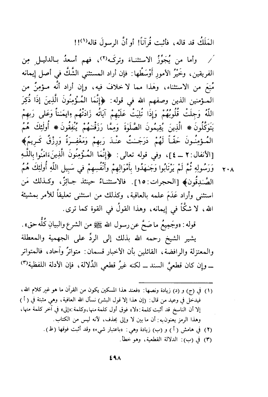 وَأَمَّا مَنْ يُجَوِّزُ الِاسْتِثْنَاءَ وَتَرْكَهُ، فَهُمْ أَسْعَدُ بِالدَّلِيلِ مِنَ الْفَرِيقَيْنِ، وَخَيْرُ الْأُمُورِ أَوْسَطُهَا: فَإِنْ أَرَادَ الْمُسْتَثْنِي الشَّكَّ فِي أَصْلِ إِيمَانِهِ مُنِعَ مِنْ الِاسْتِثْنَاءِ، وَهَذَا مِمَّا لَا خِلَافَ فِيهِ. وَإِنْ أَرَادَ أَنَّهُ مُؤْمِنٌ مِنَ الْمُؤْمِنِينَ الَّذِينَ وَصَفَهُمُ اللَّهُ فِي قَوْلِهِ: {إِنَّمَا الْمُؤْمِنُونَ الَّذِينَ إِذَا ذُكِرَ اللَّهُ وَجِلَتْ قُلُوبُهُمْ وَإِذَا تُلِيَتْ عَلَيْهِمْ آيَاتُهُ زَادَتْهُمْ إِيمَانًا وَعَلَى رَبِّهِمْ يَتَوَكَّلُونَ - الَّذِينَ يُقِيمُونَ الصَّلَاةَ وَمِمَّا رَزَقْنَاهُمْ يُنْفِقُونَ - أُولَئِكَ هُمُ الْمُؤْمِنُونَ حَقًّا لَهُمْ دَرَجَاتٌ عِنْدَ رَبِّهِمْ وَمَغْفِرَةٌ وَرِزْقٌ كَرِيمٌ} [الْحُجُرَاتِ: 15] . فَالِاسْتِثْنَاءُ حِينَئِذٍ جَائِزٌ. وَكَذَلِكَ مَنِ اسْتَثْنَى وَأَرَادَ عَدَمَ عِلْمِهِ بِالْعَاقِبَةِ، وَكَذَلِكَ مَنِ اسْتَثْنَى تَعْلِيقًا لِلْأَمْرِ بِمَشِيئَةِ اللَّهِ، لَا شَكًّا فِي إِيمَانِهِ. وَهَذَا الْقَوْلُ فِي الْقُوَّةِ كَمَا تَرَى.
