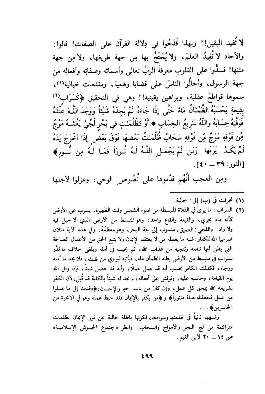 لَا تُفِيدُ الْيَقِينَ! ! وَلِهَذَا قَدَحُوا فِي دِلَالَةِ الْقُرْآنِ عَلَى الصِّفَاتِ! قَالُوا: وَالْآحَادُ لَا تُفِيدُ الْعِلْمَ، وَلَا يُحْتَجُّ بِهَا مِنْ جِهَةِ طَرِيقِهَا، وَلَا مِنْ جِهَةِ مَتْنِهَا! فَسَدُّوا عَلَى الْقُلُوبِ مَعْرِفَةَ الرَّبِّ تَعَالَى وَأَسْمَائِهِ وَصِفَاتِهِ وَأَفْعَالِهِ مِنْ جِهَةِ الرَّسُولِ، وَأَحَالُوا النَّاسَ عَلَى قَضَايَا وَهْمِيَّةٍ، وَمُقَدِّمَاتٍ خَيَالِيَّةٍ، سَمَّوْهَا قَوَاطِعَ عَقْلِيَّةً، وَبَرَاهِينَ يَقِينِيَّةً! ! وَهِيَ فِي التَّحْقِيقِ {كَسَرَابٍ بِقِيعَةٍ يَحْسَبُهُ الظَّمْآنُ مَاءً حَتَّى إِذَا جَاءَهُ لَمْ يَجِدْهُ شَيْئًا وَوَجَدَ اللَّهَ عِنْدَهُ فَوَفَّاهُ حِسَابَهُ وَاللَّهُ سَرِيعُ الْحِسَابِ - أَوْ كَظُلُمَاتٍ فِي بَحْرٍ لُجِّيٍّ يَغْشَاهُ مَوْجٌ مِنْ فَوْقِهِ مَوْجٌ مِنْ فَوْقِهِ سَحَابٌ ظُلُمَاتٌ بَعْضُهَا فَوْقَ بَعْضٍ إِذَا أَخْرَجَ يَدَهُ لَمْ يَكَدْ يَرَاهَا وَمَنْ لَمْ يَجْعَلِ اللَّهُ لَهُ نُورًا فَمَا لَهُ مِنْ نُورٍ} [النور: 39 - 40]