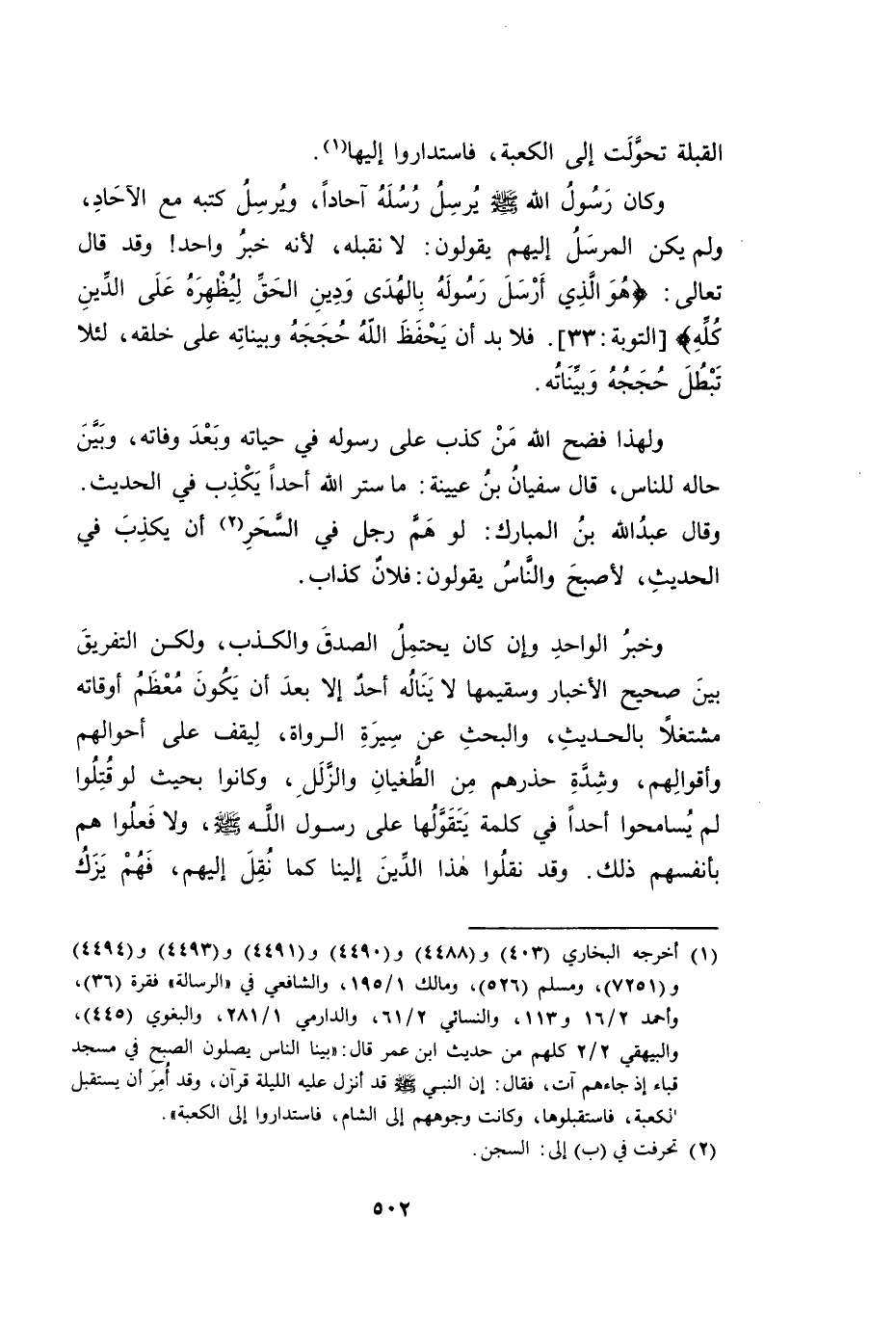 وَخَبَرُ الْوَاحِدِ وَإِنْ كَانَ يَحْتَمِلُ الصِّدْقَ وَالْكَذِبَ - وَلَكِنَّ التَّفْرِيقَ بَيْنَ صَحِيحِ الْأَخْبَارِ وَسَقِيمِهَا لَا يَنَالُهُ أَحَدٌ إِلَّا بَعْدَ أَنْ يَكُونَ مُعْظَمَ أَوْقَاتِهِ مُشْتَغِلًا بِالْحَدِيثِ، وَالْبَحْثِ عَنْ سِيرَةِ الرُّوَاةِ، لِيَقِفَ عَلَى أَحْوَالِهِمْ وَأَقْوَالِهِمْ، وَشِدَّةِ حَذَرِهِمْ مِنَ الطُّغْيَانِ وَالزَّلَلِ، وَكَانُوا بِحَيْثُ لَوْ قُتِلُوا لَمْ يُسَامِحُوا أَحَدًا فِي كَلِمَةٍ يَتَقَوَّلُهَا عَلَى رَسُولِ اللَّهِ صَلَّى اللَّهُ عَلَيْهِ وَسَلَّمَ، وَلَا فَعَلُوا هُمْ بِأَنْفُسِهِمْ ذَلِكَ. وَقَدْ نَقَلُوا هَذَا الدِّينَ إِلَيْنَا كَمَا نُقِلَ إِلَيْهِمْ، فَهُمْ يَزَكُ
