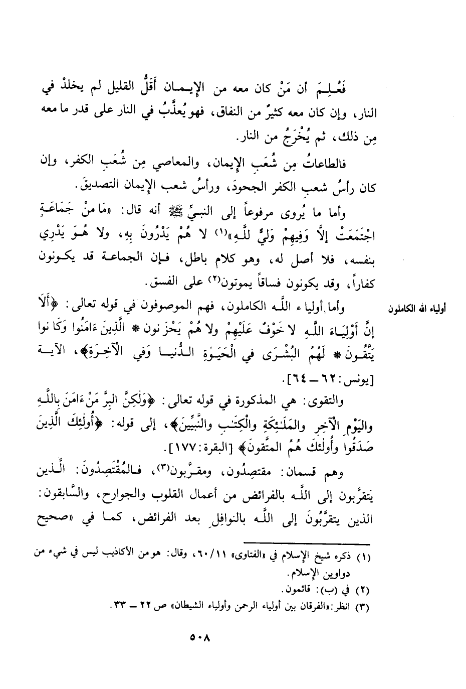 وَأَمَّا أَوْلِيَاءُ اللَّهِ الْكَامِلُونَ فَهُمُ الْمَوْصُوفُونَ فِي قَوْلِهِ تَعَالَى: {أَلَا إِنَّ أَوْلِيَاءَ اللَّهِ لَا خَوْفٌ عَلَيْهِمْ وَلَا هُمْ يَحْزَنُونَ - الَّذِينَ آمَنُوا وَكَانُوا يَتَّقُونَ - لَهُمُ الْبُشْرَى فِي الْحَيَاةِ الدُّنْيَا وَفِي الْآخِرَةِ} [يونس: 62 - 64] الْآيَةَ. [يُونُسَ: 62 - 64]