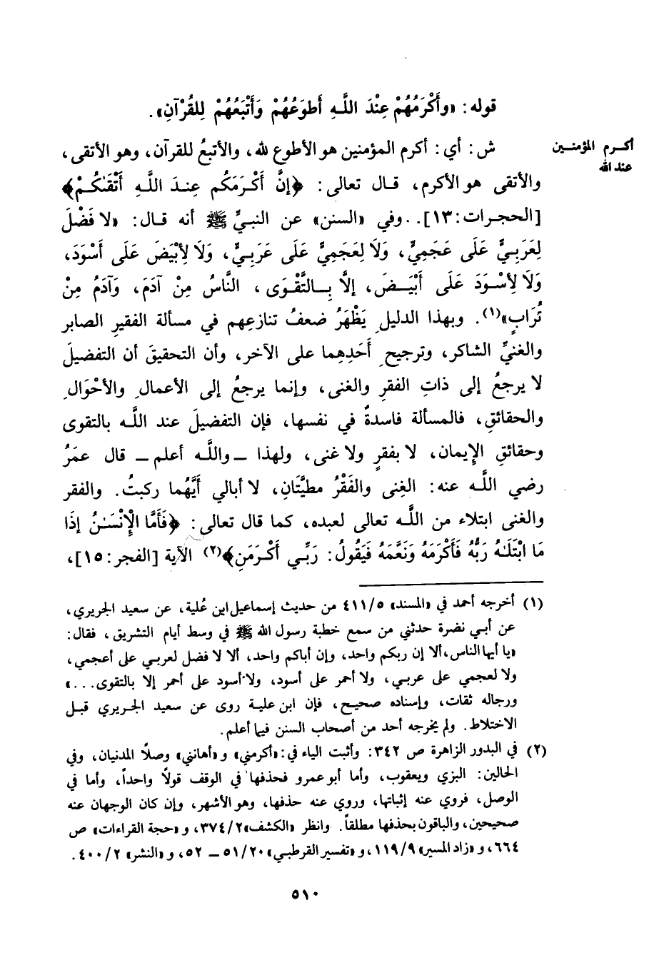 قَوْلُهُ: (وَأَكْرَمُهُمْ عِنْدَ اللَّهِ أَطْوَعُهُمْ وَأَتْبَعُهُمْ لِلْقُرْآنِ) . ش: أَيْ أَكْرَمُ الْمُؤْمِنِينَ هُوَ الْأَطْوَعُ لِلَّهِ وَالْأَتْبَعُ لِلْقُرْآنِ، وَهُوَ الْأَتْقَى، وَالْأَتْقَى هُوَ الْأَكْرَمُ، قَالَ تَعَالَى: {إِنَّ أَكْرَمَكُمْ عِنْدَ اللَّهِ أَتْقَاكُمْ} [الْحُجُرَاتِ: 13] . وَفِي السُّنَنِ عَنِ النَّبِيِّ صَلَّى اللَّهُ عَلَيْهِ وَسَلَّمَ أَنَّهُ قَالَ: «لَا فَضْلَ لِعَرَبِيٍّ عَلَى عَجَمِيٍّ، وَلَا لِعَجَمِيٍّ عَلَى عَرَبِيٍّ، وَلَا لِأَبْيَضَ عَلَى أَسْوَدَ، وَلَا لِأَسْوَدَ عَلَى أَبْيَضَ -: إِلَّا بِالتَّقْوَى، النَّاسُ مِنْ آدَمَ، وَآدَمُ مِنْ تُرَابٍ» . وَبِهَذَا الدَّلِيلِ يَظْهَرُ ضَعْفُ تَنَازُعِهِمْ فِي مَسْأَلَةِ الْفَقِيرِ الصَّابِرِ وَالْغَنِيِّ الشَّاكِرِ، وَتَرْجِيحِ أَحَدِهِمَا عَلَى الْآخَرِ، وَأَنَّ التَّحْقِيقَ أَنَّ التَّفْضِيلَ لَا يَرْجِعُ إِلَى ذَاتِ الْفَقْرِ وَالْغِنَى، وَإِنَّمَا يَرْجِعُ إِلَى الْأَعْمَالِ وَالْأَحْوَالِ وَالْحَقَائِقِ، فَالْمَسْأَلَةُ فَاسِدَةٌ فِي نَفْسِهَا. فَإِنَّ التَّفْضِيلَ عِنْدَ اللَّهِ بِالتَّقْوَى وَحَقَائِقِ الْإِيمَانِ، لَا بِفَقْرٍ وَلَا غِنًى. وَلِهَذَا - وَاللَّهُ أَعْلَمُ - قَالَ عُمَرُ رَضِيَ اللَّهُ عَنْهُ: الْغِنَى وَالْفَقْرُ مَطِيَّتَانِ، لَا أُبَالِي أَيُّهُمَا رَكِبْتُ. وَالْفَقْرُ وَالْغِنَى ابْتِلَاءٌ مِنَ اللَّهِ تَعَالَى لِعَبْدِهِ، كَمَا قَالَ تَعَالَى: {فَأَمَّا الْإِنْسَانُ إِذَا مَا ابْتَلَاهُ رَبُّهُ فَأَكْرَمَهُ وَنَعَّمَهُ فَيَقُولُ رَبِّي أَكْرَمَنِ} [الفجر: 15] الْآيَةَ [الْفَجْرِ: 15] .