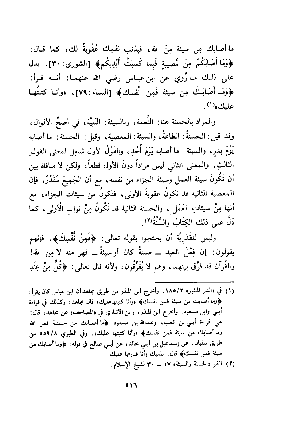 وَالْمُرَادُ بِالْحَسَنَةِ هُنَا النِّعْمَةُ، وَبِالسَّيِّئَةِ الْبَلِيَّةُ، فِي أَصَحِّ الْأَقْوَالِ. وَقَدْ قِيلَ: الْحَسَنَةُ الطَّاعَةُ، وَالسَّيِّئَةُ الْمَعْصِيَةُ. وَقِيلَ: الْحَسَنَةُ مَا أَصَابَهُ يَوْمَ بَدْرٍ، وَالسَّيِّئَةُ مَا أَصَابَهُ يَوْمَ أُحُدٍ. وَالْقَوْلُ الْأَوَّلُ شَامِلٌ لِمَعْنَى الْقَوْلِ الثَّالِثِ. وَالْمَعْنَى الثَّانِي لَيْسَ مُرَادًا دُونَ الْأَوَّلِ قَطْعًا، وَلَكِنْ لَا مُنَافَاةَ بَيْنَ أَنْ تَكُونَ سَيِّئَةُ الْعَمَلِ وَسَيِّئَةُ الْجَزَاءِ مِنْ نَفْسِهِ، مَعَ أَنَّ الْجَمِيعَ مُقَدَّرٌ، فَإِنَّ الْمَعْصِيَةَ الثَّانِيَةَ قَدْ تَكُونُ عُقُوبَةَ الْأُولَى، فَتَكُونُ مِنْ سَيِّئَاتِ الْجَزَاءِ، مَعَ أَنَّهَا مِنْ سَيِّئَاتِ الْعَمَلِ، وَالْحَسَنَةُ الثَّانِيَةُ قَدْ تَكُونُ مِنْ ثَوَابِ الْأُولَى، كَمَا دَلَّ عَلَى ذَلِكَ الْكِتَابُ وَالسُّنَّةُ. وَلَيْسَ لِلْقَدَرِيَّةِ أَنْ يَحْتَجُّوا بِقَوْلِهِ تَعَالَى: فَمِنْ نَفْسِكَ، فَإِنَّهُمْ يَقُولُونَ: إِنْ فَعَلَ الْعَبْدُ - حَسَنَةً كَانَ أَوْ سَيِّئَةً - فَهُوَ مِنْهُ لَا مِنَ اللَّهِ! وَالْقُرْآنُ قَدْ فَرَّقَ بَيْنَهُمَا، وَهُمْ لَا يُفَرِّقُونَ، وَلِأَنَّهُ قَالَ تَعَالَى: كُلٌّ مِنْ عِنْدِ اللَّهِ