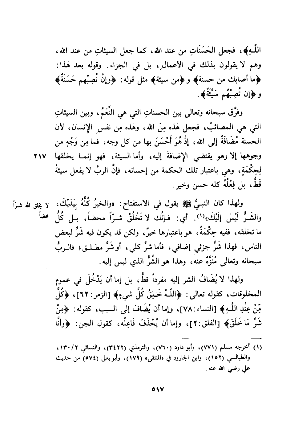 وَلِهَذَا كَانَ النَّبِيُّ صَلَّى اللَّهُ عَلَيْهِ وَسَلَّمَ يَقُولُ فِي الِاسْتِفْتَاحِ: «وَالْخَيْرُ كُلُّهُ بِيَدَيْكَ، وَالشَّرُّ لَيْسَ إِلَيْكَ» . أَيْ: فَإِنَّكَ لَا تَخْلُقُ شَرًّا مَحْضًا، بَلْ كُلُّ مَا يَخْلُقُهُ فَفِيهِ حِكْمَةٌ، هُوَ بِاعْتِبَارِهَا خَيْرٌ، وَلَكِنْ قَدْ يَكُونُ فِيهِ شَرٌّ لِبَعْضِ النَّاسِ، فَهَذَا شَرٌّ جُزْئِيٌّ إِضَافِيٌّ، فَأَمَّا شَرٌّ كُلِّيٌّ، أَوْ شَرٌّ مُطْلَقٌ -: فَالرَّبُّ سُبْحَانَهُ وَتَعَالَى مُنَزَّهٌ عَنْهُ. وَهَذَا هُوَ الشَّرُّ الَّذِي لَيْسَ إِلَيْهِ.