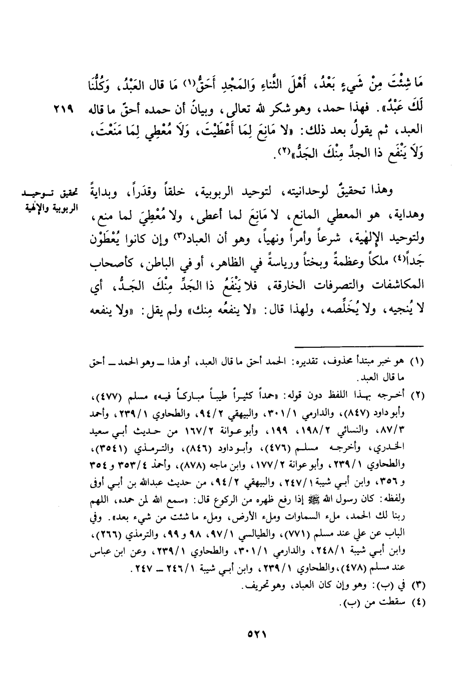 مَا شِئْتَ مِنْ شَيْءٍ بَعْدُ، أَهْلَ الثَّنَاءِ وَالْمَجْدِ، أَحَقُّ مَا قَالَ الْعَبْدُ، وَكُلُّنَا لَكَ عَبْدٌ» . فَهَذَا حَمْدٌ، وَهُوَ شُكْرٌ لِلَّهِ تَعَالَى، وَبَيَانُ أَنَّ حَمْدَهُ أَحَقُّ مَا قَالَهُ الْعَبْدُ، ثُمَّ يَقُولُ بَعْدَ ذَلِكَ: «لَا مَانِعَ لِمَا أَعْطَيْتَ، وَلَا مُعْطِيَ لِمَا مَنَعْتَ، وَلَا يَنْفَعُ ذَا الْجَدِّ مِنْكَ الْجَدُّ» .